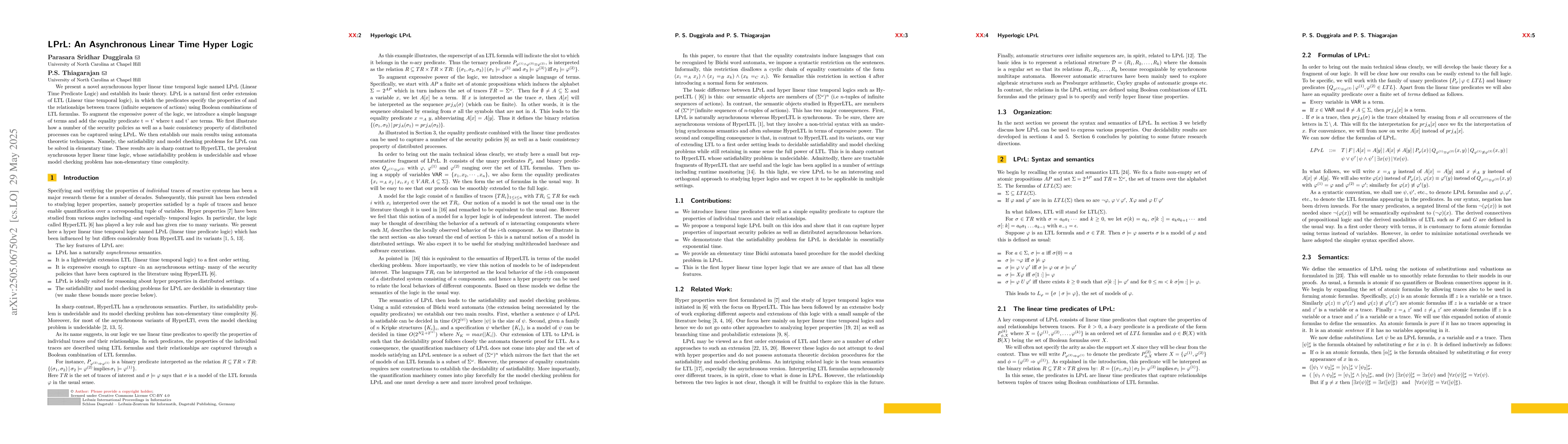 LPrL differs from existing logics, such as HyperLTL, by being asynchronous, a first-order extension of LTL, and offering the ability to express properties with equality predicates in linear time.
