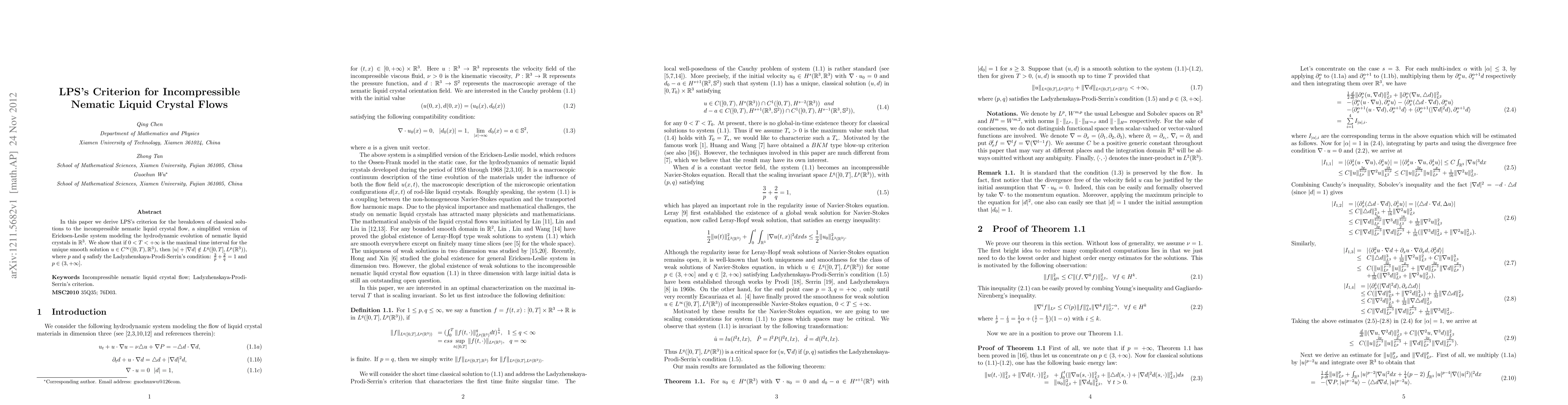 This paper derives LPS's criterion for the breakdown of classical solutions to incompressible nematic liquid crystal flows, showing that if the solution exists only up to a finite time $T$, then certain integrability conditions on the velocity and director field gradients are not satisfied.