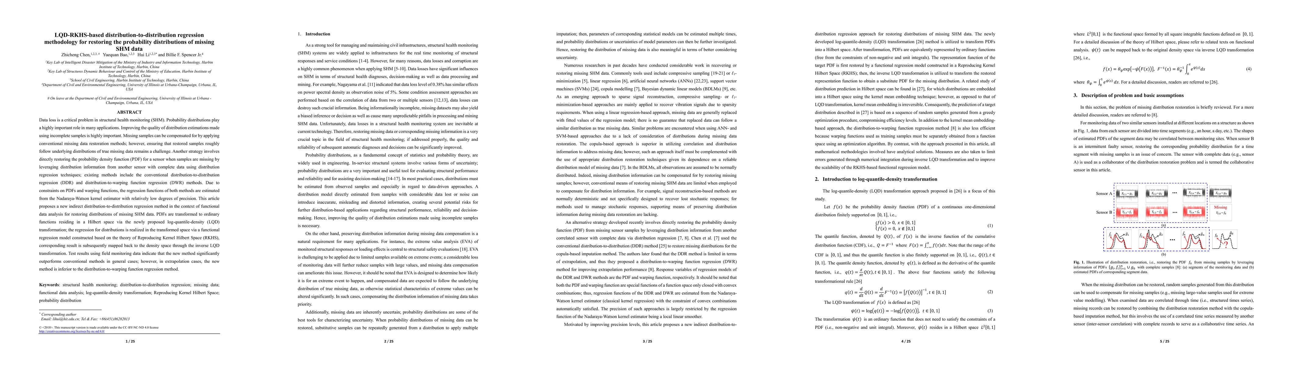 This paper proposes a new LQD-RKHS-based distribution-to-distribution regression methodology for restoring missing probability distributions in structural health monitoring (SHM) data. The method transforms probability density functions to log-quantile-density functions and uses a functional regression model in Reproducing Kernel Hilbert Space for improved precision, outperforming conventional methods in most cases.
