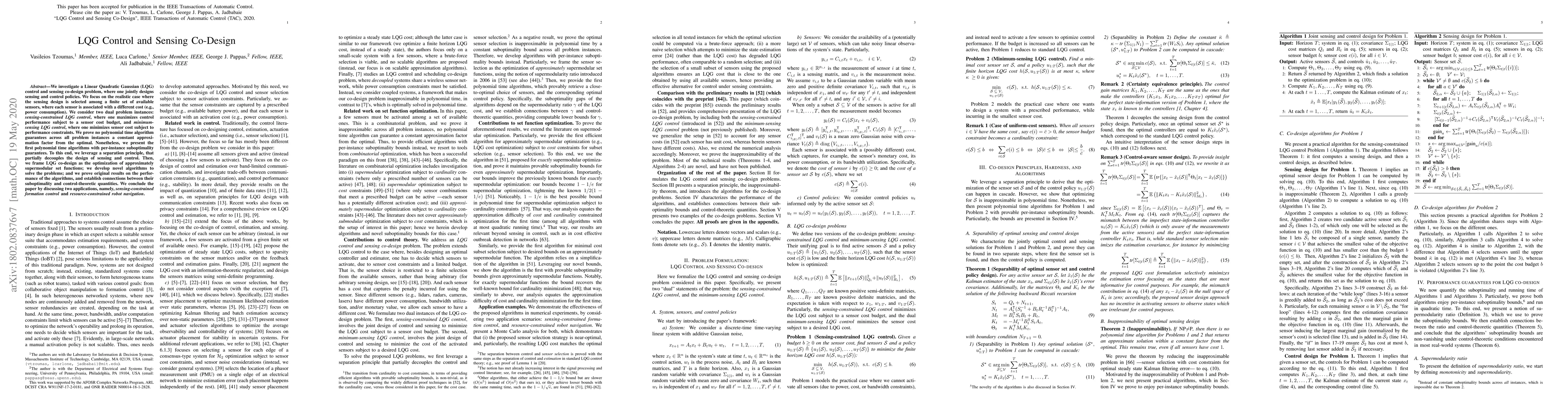 This paper explores the joint design of Linear-Quadratic-Gaussian (LQG) control and sensing policies, considering a finite set of cost-associated sensors. It presents polynomial time algorithms with per-instance suboptimality guarantees, leveraging a separation principle and optimization of supermodular set functions, and discusses applications in formation control and robot navigation.