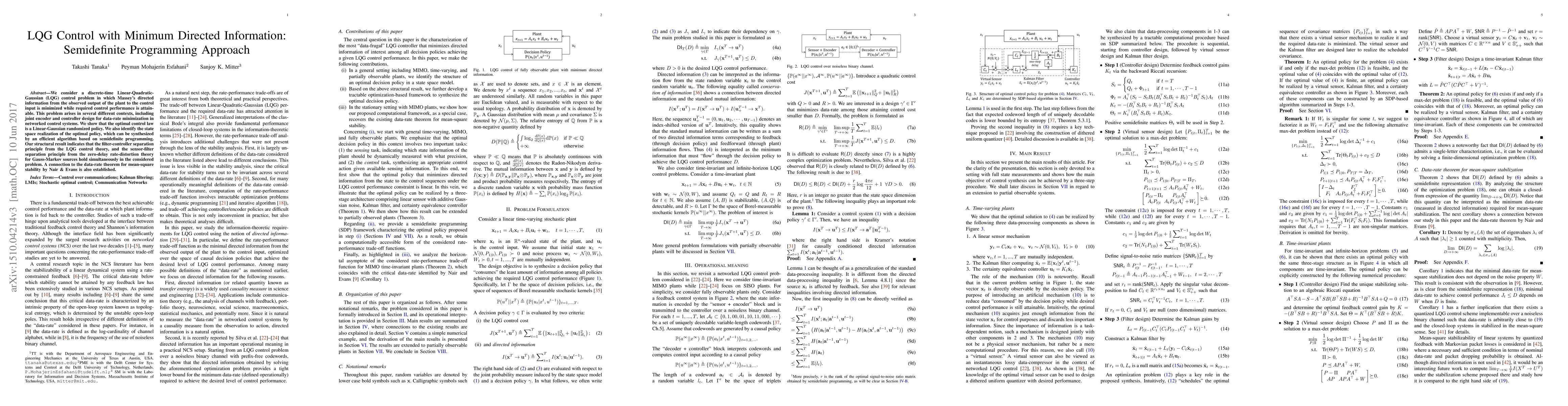 This paper presents an LQG control approach where Massey's directed information from the plant output to control input is minimized. The optimal control law is a Linear-Gaussian randomized policy synthesized using semidefinite programming, confirming filter-controller and sensor-filter separation principles.