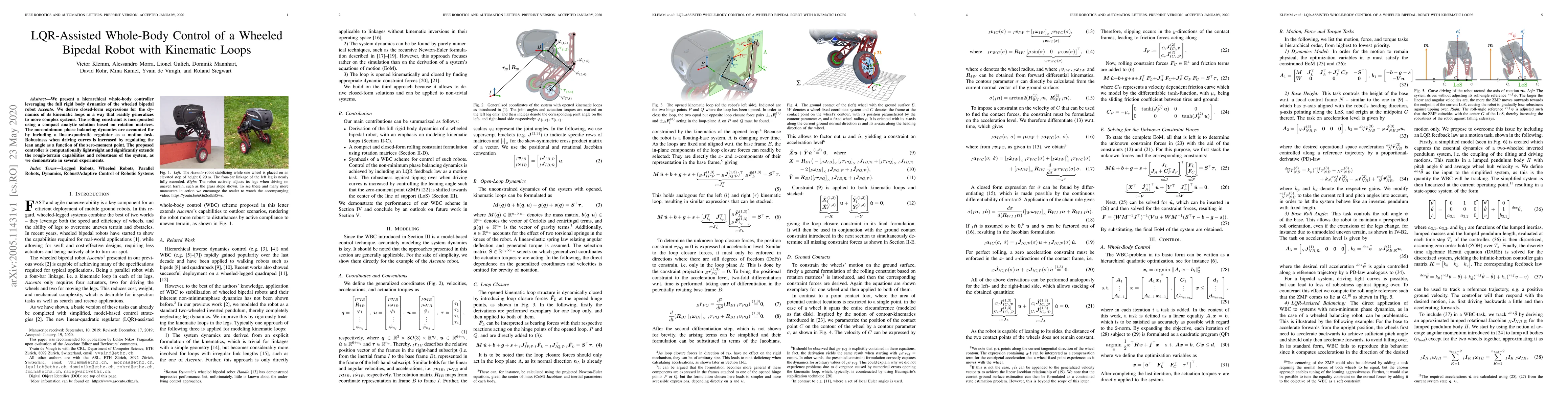 This paper proposes a hierarchical whole-body controller for a wheeled bipedal robot, incorporating kinematic loop dynamics and a linear-quadratic regulator for balancing. The approach enhances the robot's rough-terrain capabilities and robustness, demonstrated through experiments.