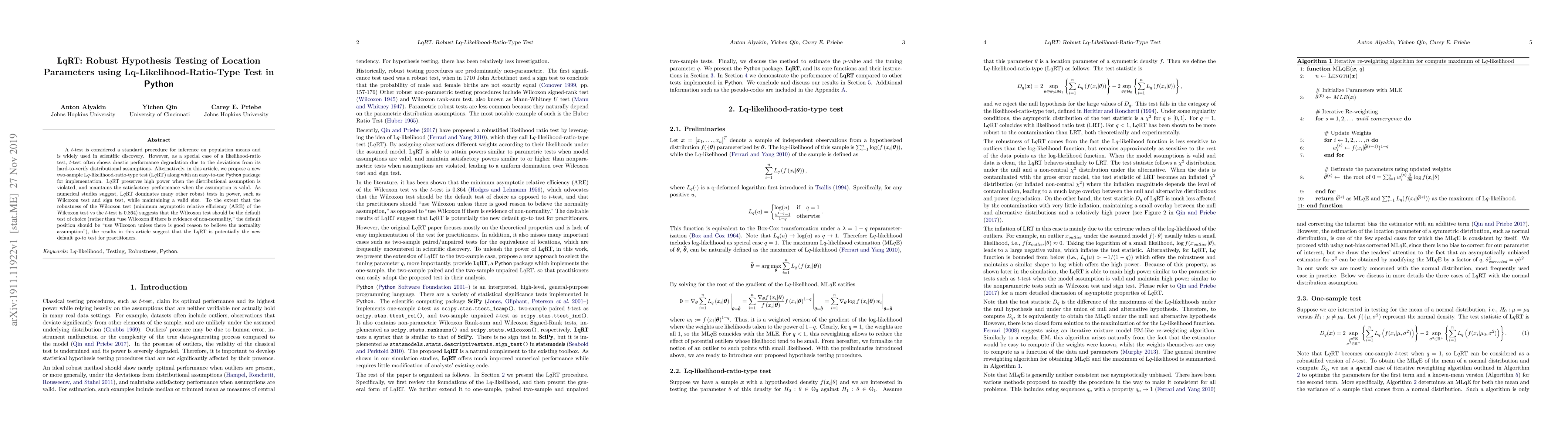 This paper proposes a new Lq-likelihood-ratio-type test (LqRT) for robust hypothesis testing of location parameters, offering high power and valid size even when distributional assumptions are violated. The LqRT outperforms other robust tests like the Wilcoxon test in terms of power while maintaining satisfactory performance under valid assumptions.