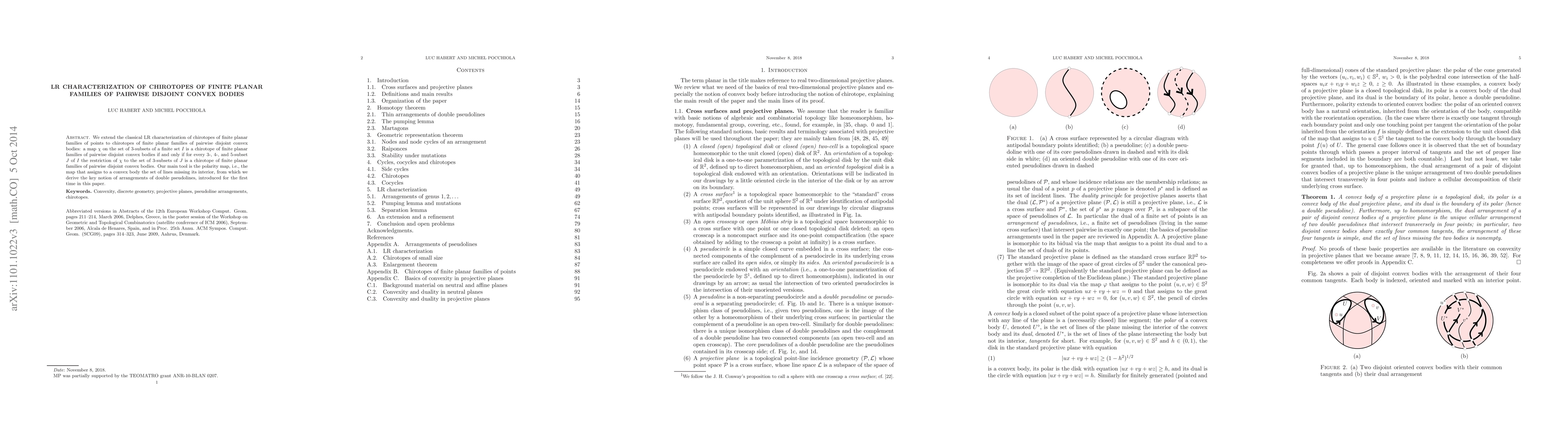 We extend the classical LR characterization of chirotopes of finite planar families of points to chirotopes of finite planar families of pairwise disjoint convex bodies: a map \c{hi} on the set of 3-subsets of a finite set I is a chirotope of finite planar families of pairwise disjoint convex bodies if and only if for every 3-, 4-, and 5-subset J of I the restriction of \c{hi} to the set of 3-subsets of J is a chirotope of finite planar families of pairwise disjoint convex bodies. Our main tool is the polarity map, i.e., the map that assigns to a convex body the set of lines missing its interior, from which we derive the key notion of arrangements of double pseudolines, introduced for the first time in this paper.