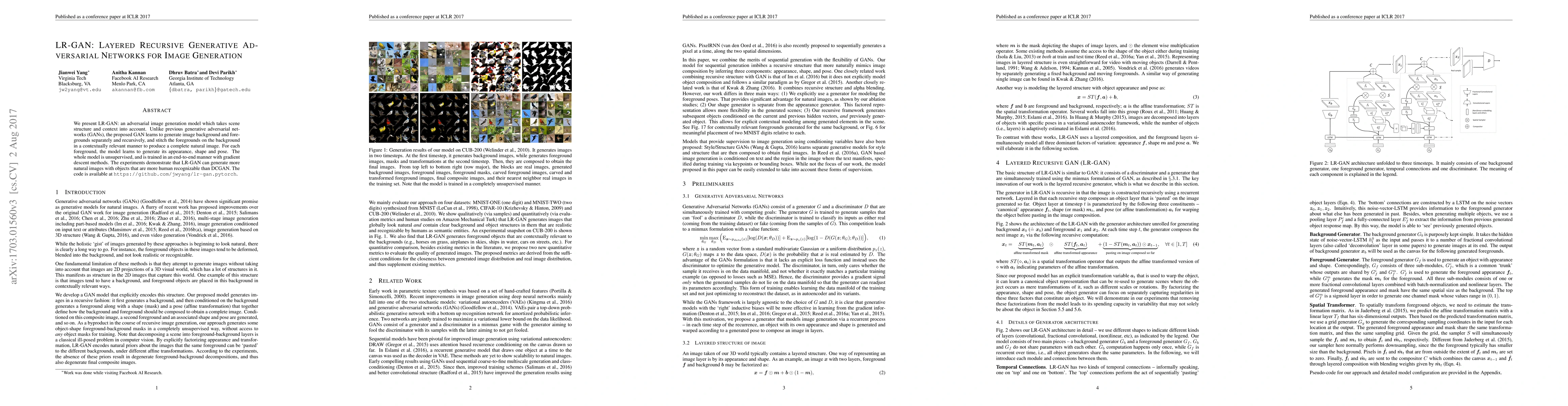 LR-GAN is an unsupervised generative adversarial network that generates images by recursively creating and combining background and foreground elements in a context-aware manner. It outperforms DCGAN by producing more natural and recognizable images with distinct object shapes and poses.
