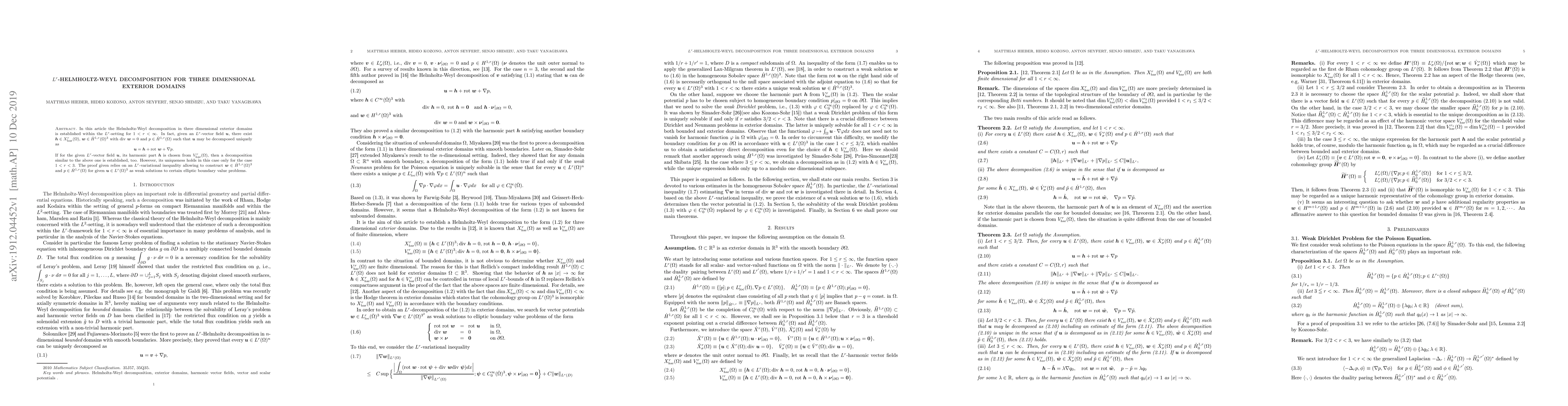Summary: This paper establishes the Helmholtz-Weyl decomposition in three-dimensional exterior domains within the $L^r$ framework for $1<p<\infty$, providing a rigorous mathematical foundation for the analysis of vector fields in such domains.