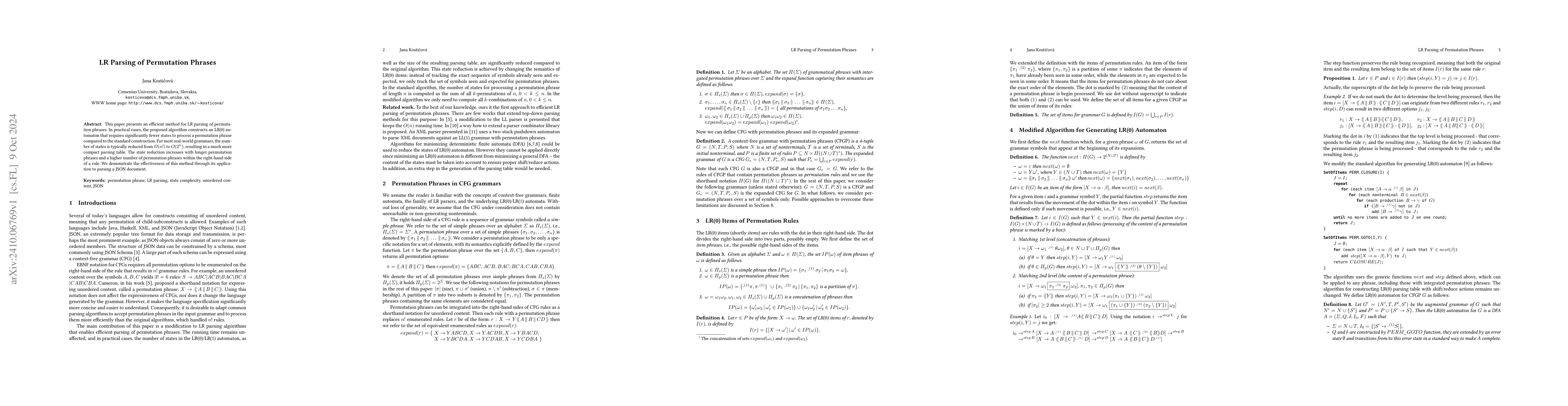 This paper introduces an efficient LR parsing algorithm for permutation phrases, reducing the state complexity from $\Omega(n!)$ to $O(2^{n})$, significantly improving parsing efficiency. The method is demonstrated via parsing a JSON document.