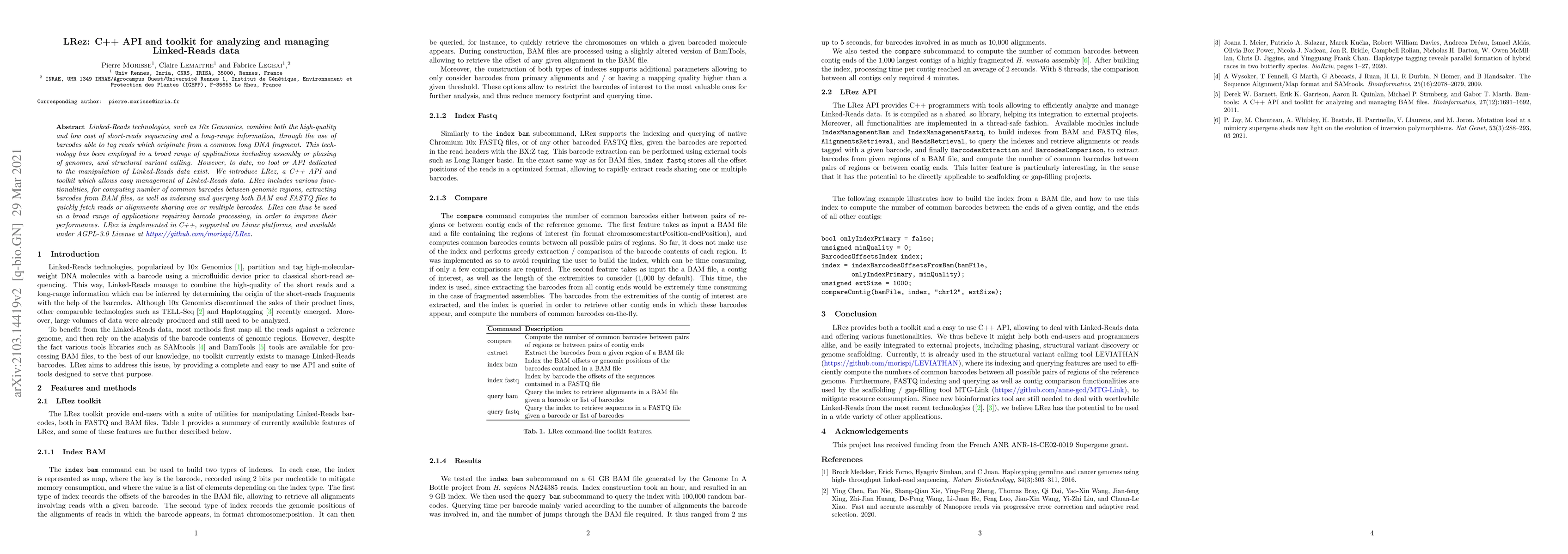 Linked-Reads technologies, such as 10x Genomics, combine both the high-quality and low cost of short-reads sequencing and a long-range information, through the use of barcodes able to tag reads which originate from a common long DNA fragment. This technology has been employed in a broad range of applications including assembly or phasing of genomes, and structural variant calling. However, to date, no tool or API dedicated to the manipulation of Linked-Reads data exist. We introduce LRez, a C++ API and toolkit which allows easy management of Linked-Reads data. LRez includes various functionalities, for computing number of common barcodes between genomic regions, extracting barcodes from BAM files, as well as indexing and querying both BAM and FASTQ files to quickly fetch reads or alignments sharing one or multiple barcodes. LRez can thus be used in a broad range of applications requiring barcode processing, in order to improve their performances. LRez is implemented in C++, supported on Linux platforms, and available under AGPL-3.0 License at https://github.com/morispi/LRez.