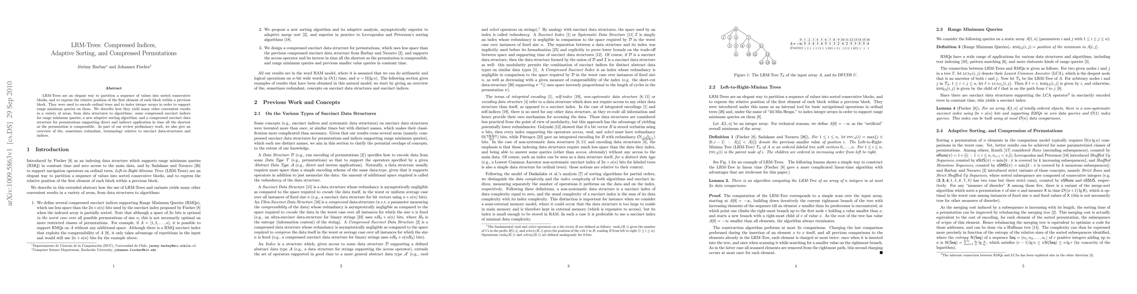 LRM-Trees partition a sequence into sorted blocks and encode relative positions, enabling efficient range minimum queries and adaptive sorting. They also offer succinct data structures for permutations and compressed indices.