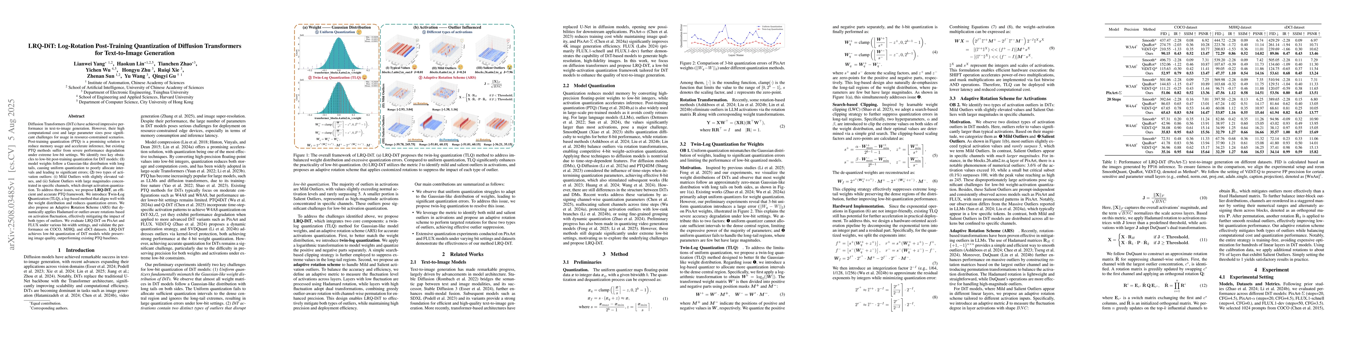 Diffusion Transformers (DiTs) have achieved impressive performance in text-to-image generation. However, their high computational cost and large parameter sizes pose significant challenges for usage in resource-constrained scenarios. Post-training quantization (PTQ) is a promising solution to reduce memory usage and accelerate inference, but existing PTQ methods suffer from severe performance degradation under extreme low-bit settings. We identify two key obstacles to low-bit post-training quantization for DiT models: (1) model weights follow a Gaussian-like distribution with long tails, causing uniform quantization to poorly allocate intervals and leading to significant errors; (2) two types of activation outliers: (i) Mild Outliers with slightly elevated values, and (ii) Salient Outliers with large magnitudes concentrated in specific channels, which disrupt activation quantization. To address these issues, we propose LRQ-DiT, an efficient and accurate PTQ framework. We introduce Twin-Log Quantization (TLQ), a log-based method that aligns well with the weight distribution and reduces quantization errors. We also propose an Adaptive Rotation Scheme (ARS) that dynamically applies Hadamard or outlier-aware rotations based on activation fluctuation, effectively mitigating the impact of both types of outliers. We evaluate LRQ-DiT on PixArt and FLUX under various bit-width settings, and validate the performance on COCO, MJHQ, and sDCI datasets. LRQ-DiT achieves low-bit quantization of DiT models while preserving image quality, outperforming existing PTQ baselines.