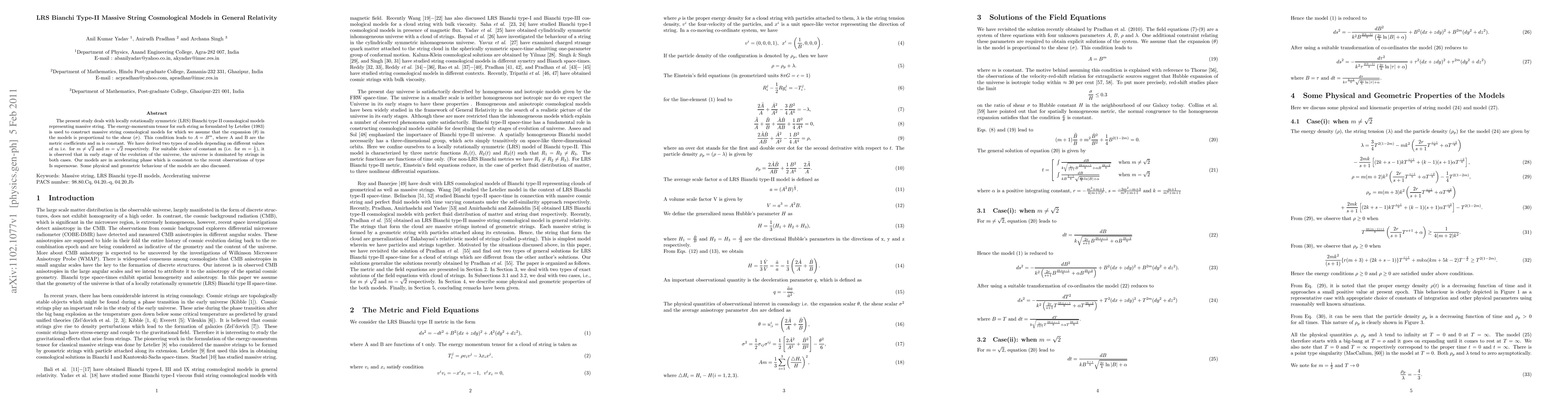 This paper explores LRS Bianchi Type-II cosmological models incorporating massive strings, deriving two types based on different values of a constant m. The models show an accelerating universe phase, consistent with recent supernovae observations, and suggest string dominance in the early universe.