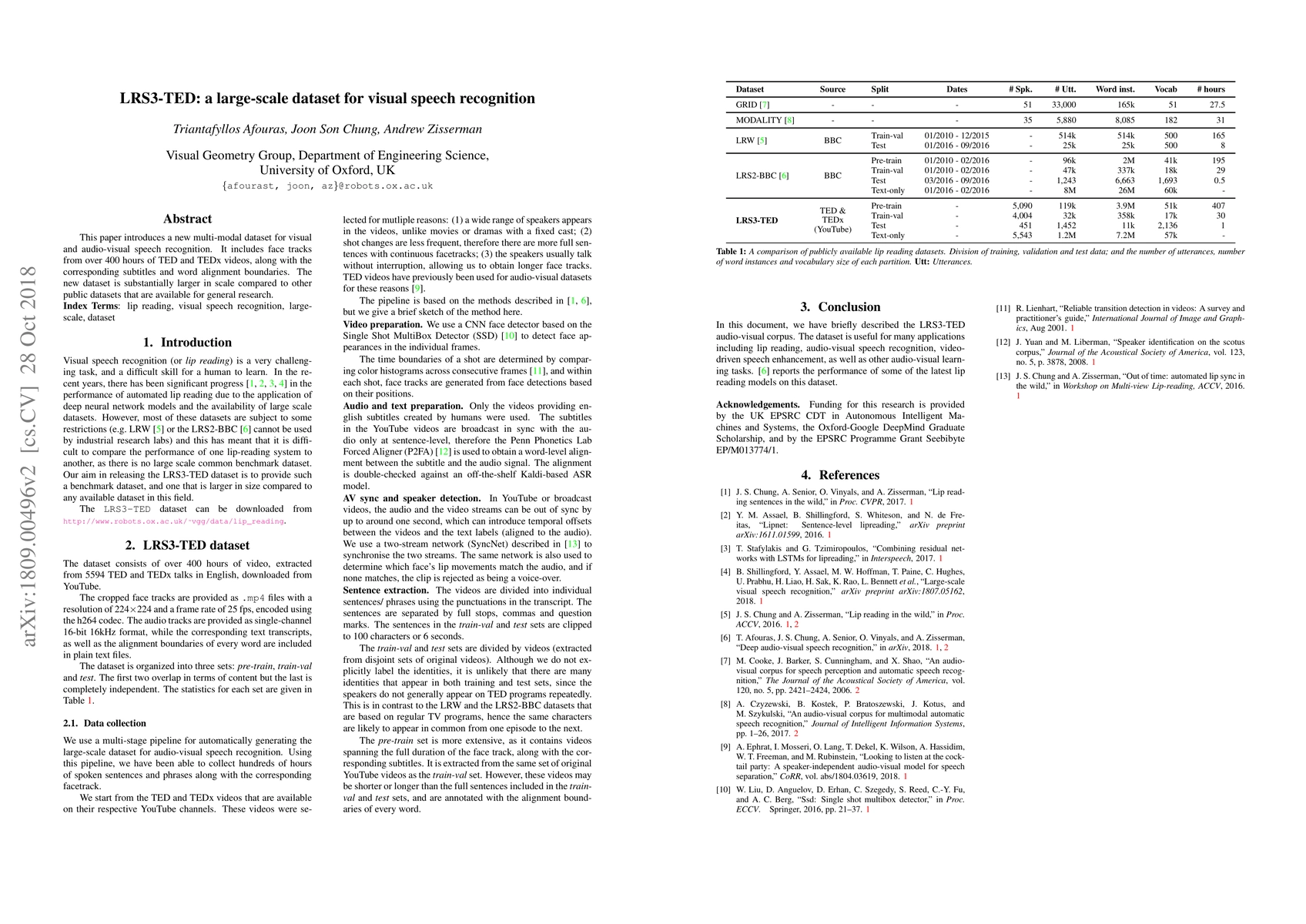 This paper presents LRS3-TED, a large-scale dataset for visual and audio-visual speech recognition, featuring over 400 hours of face tracks from TED and TEDx videos, along with subtitles and word alignments, surpassing existing datasets in size.