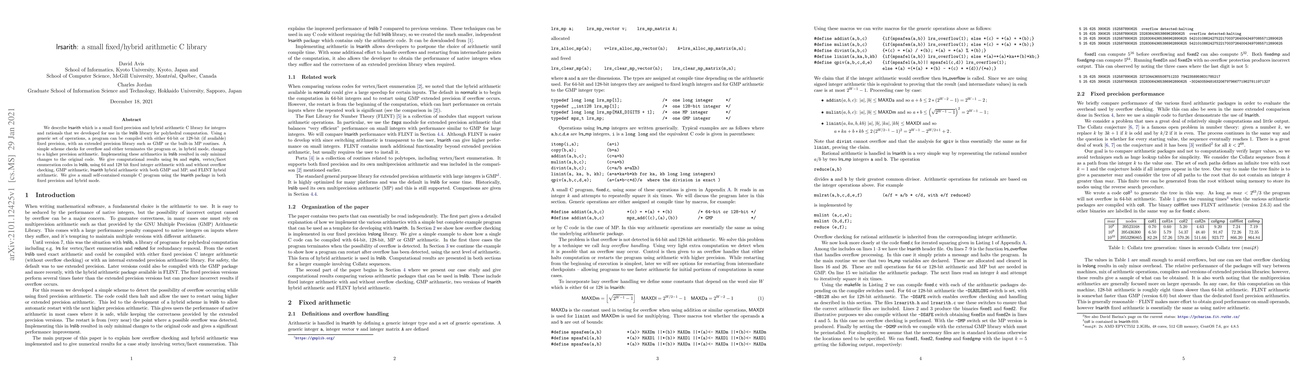 We describe lrsarith which is a small fixed precision and hybrid arithmetic C library for integers and rationals that we developed for use in the lrslib library for polyhedral computation. Using a generic set of operations, a program can be compiled with either 64-bit or 128-bit (if available) fixed precision, with an extended precision library such as GMP or the built-in MP routines. A simple scheme checks for overflow and either terminates the program or, in hybrid mode, changes to a higher precision arithmetic. Implementing these arithmetics in lrslib resulted in only minimal changes to the original code. We give computational results using lrs and mplrs, vertex/facet enumeration codes in lrslib, using 64 and 128 bit fixed integer arithmetic with and without overflow checking, GMP arithmetic, lrsarith hybrid arithmetic with both GMP and MP, and FLINT hybrid arithmetic. We give a small self-contained example C program using the lrsarith package in both fixed precision and hybrid mode.
