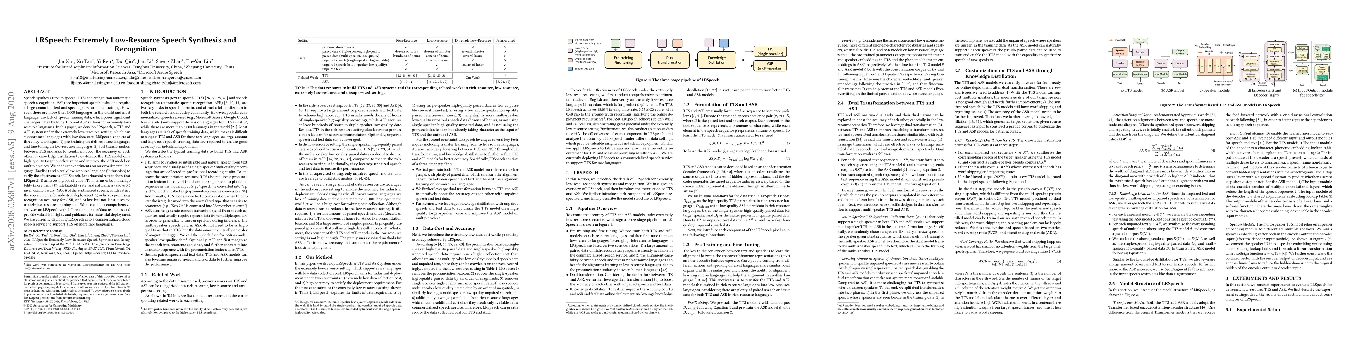 LRSpeech is a novel TTS and ASR system designed to support extremely low-resource languages, utilizing pre-training on rich-resource languages, dual transformation between TTS and ASR, and knowledge distillation. Experiments demonstrate high-quality TTS and promising ASR accuracy with minimal training data.