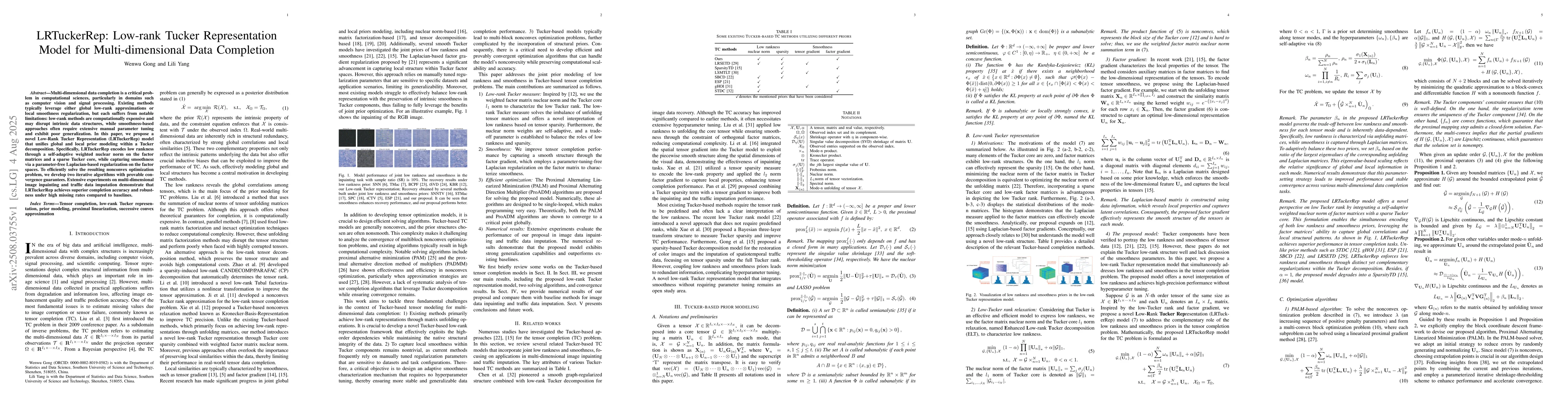 Multi-dimensional data completion is a critical problem in computational sciences, particularly in domains such as computer vision, signal processing, and scientific computing. Existing methods typically leverage either global low-rank approximations or local smoothness regularization, but each suffers from notable limitations: low-rank methods are computationally expensive and may disrupt intrinsic data structures, while smoothness-based approaches often require extensive manual parameter tuning and exhibit poor generalization. In this paper, we propose a novel Low-Rank Tucker Representation (LRTuckerRep) model that unifies global and local prior modeling within a Tucker decomposition. Specifically, LRTuckerRep encodes low rankness through a self-adaptive weighted nuclear norm on the factor matrices and a sparse Tucker core, while capturing smoothness via a parameter-free Laplacian-based regularization on the factor spaces. To efficiently solve the resulting nonconvex optimization problem, we develop two iterative algorithms with provable convergence guarantees. Extensive experiments on multi-dimensional image inpainting and traffic data imputation demonstrate that LRTuckerRep achieves superior completion accuracy and robustness under high missing rates compared to baselines.