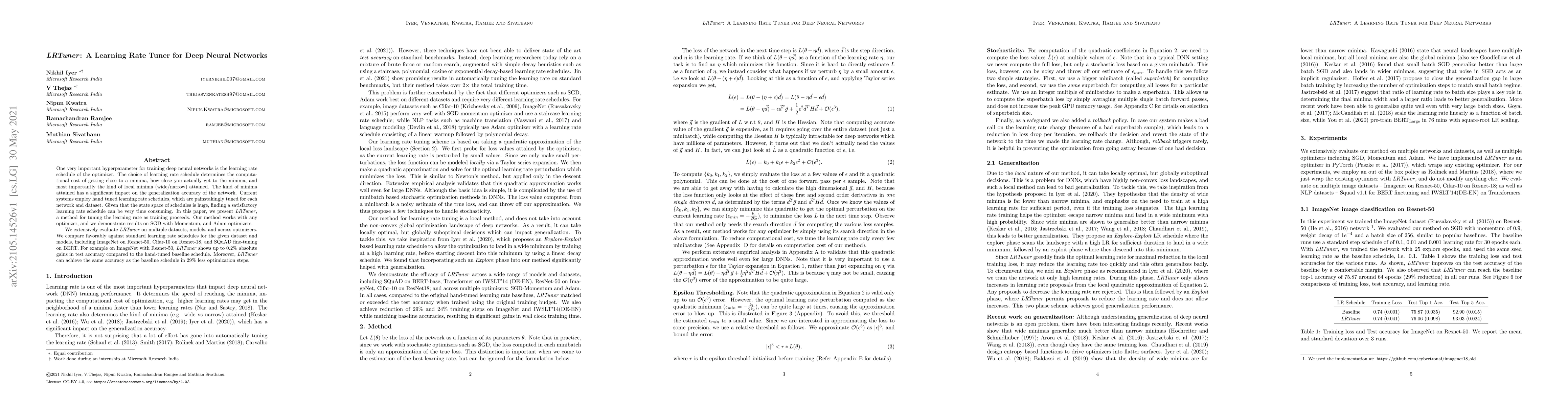 LRTuner is a method for dynamically tuning the learning rate during training of deep neural networks, working with various optimizers like SGD with Momentum and Adam. It outperforms hand-tuned learning rate schedules, achieving up to 0.2% absolute gains in test accuracy and requiring 29% fewer optimization steps on datasets like ImageNet and Cifar-10.