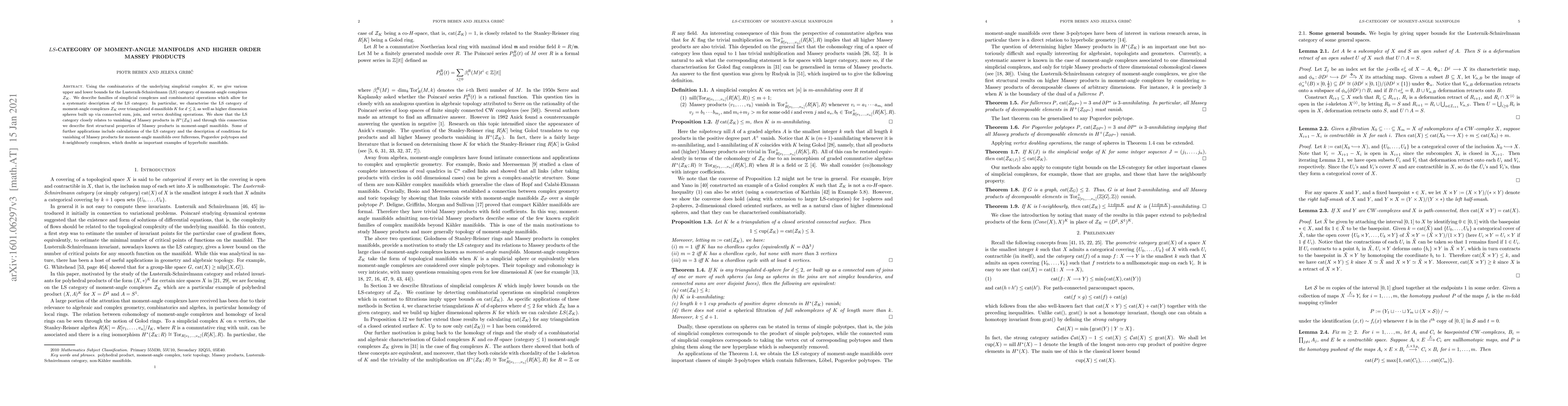The paper provides combinatorial bounds for the Lusternik-Schnirelmann (LS) category of moment-angle complexes and relates it to the vanishing of higher order Massey products in their cohomology, establishing structural properties and applications to various simplicial complexes and manifolds.