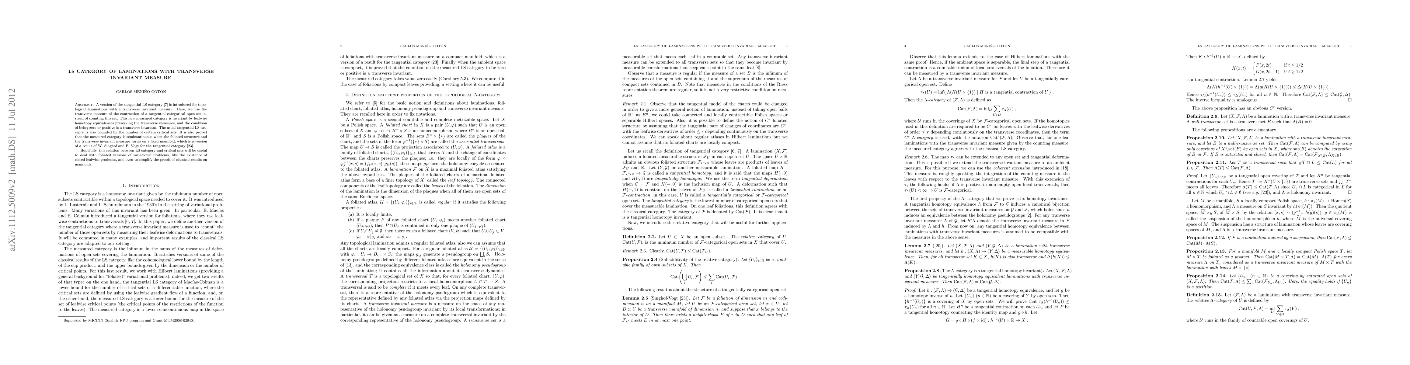 A version of the tangential LS category is introduced for topological laminations with a transverse invariant measure. Here, we use the transverse measure of the contraction of a tangential categorical open set instead of counting this set. This new measured category is invariant by leafwise homotopy equivalences preserving the transverse measures, and the condition of being zero or positive is a transverse invariant. The usual tangential LS category is also bounded by the number of certain critical sets. It is also proved that the measured category is semicontinuous when the foliated structure and the transverse invariant measure varies on a fixed manifold, which is a version of a result of W. Singhof and E. Vogt for the tangential category. Hopefully, this relation between LS category and critical sets will be useful to deal with foliated versions of variational problems, like the existence of closed leafwise geodesics, and even to simplify the proofs of classical results on manifolds.