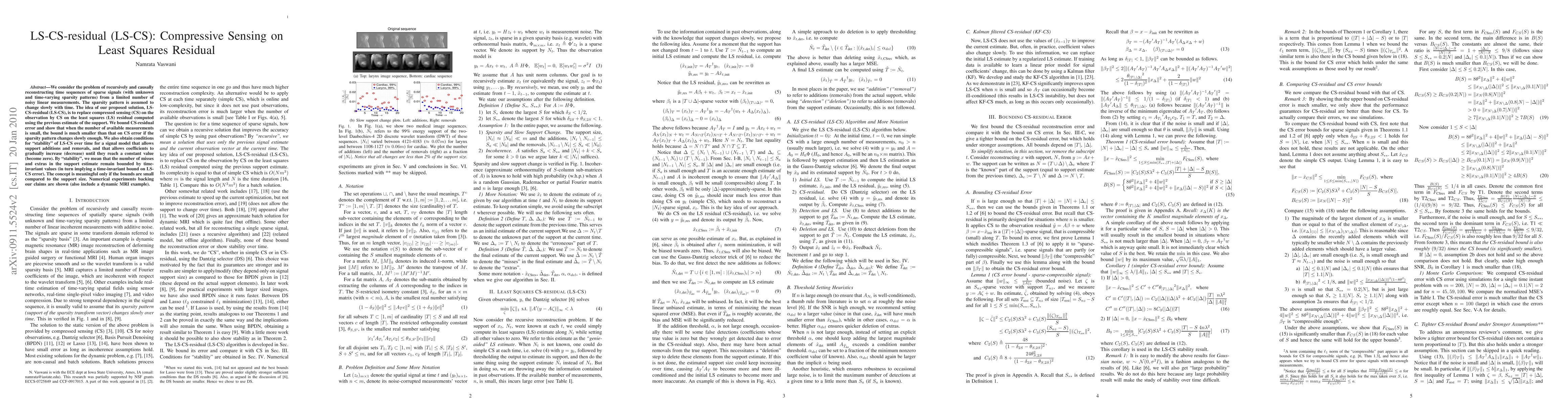 We consider the problem of recursively and causally reconstructing time sequences of sparse signals (with unknown and time-varying sparsity patterns) from a limited number of noisy linear measurements. The sparsity pattern is assumed to change slowly with time. The idea of our proposed solution, LS-CS-residual (LS-CS), is to replace compressed sensing (CS) on the observation by CS on the least squares (LS) residual computed using the previous estimate of the support. We bound CS-residual error and show that when the number of available measurements is small, the bound is much smaller than that on CS error if the sparsity pattern changes slowly enough. We also obtain conditions for "stability" of LS-CS over time for a signal model that allows support additions and removals, and that allows coefficients to gradually increase (decrease) until they reach a constant value (become zero). By "stability", we mean that the number of misses and extras in the support estimate remain bounded by time-invariant values (in turn implying a time-invariant bound on LS-CS error). The concept is meaningful only if the bounds are small compared to the support size. Numerical experiments backing our claims are shown.