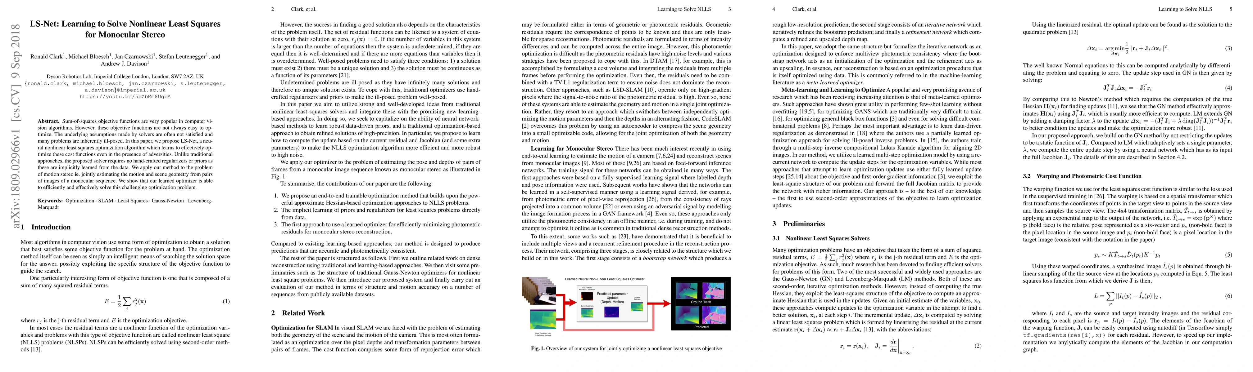 A new algorithm called LS-Net is proposed to optimize nonlinear least squares objective functions in computer vision, without requiring hand-crafted regularizers or priors, effectively solving challenging problems like monocular stereo.