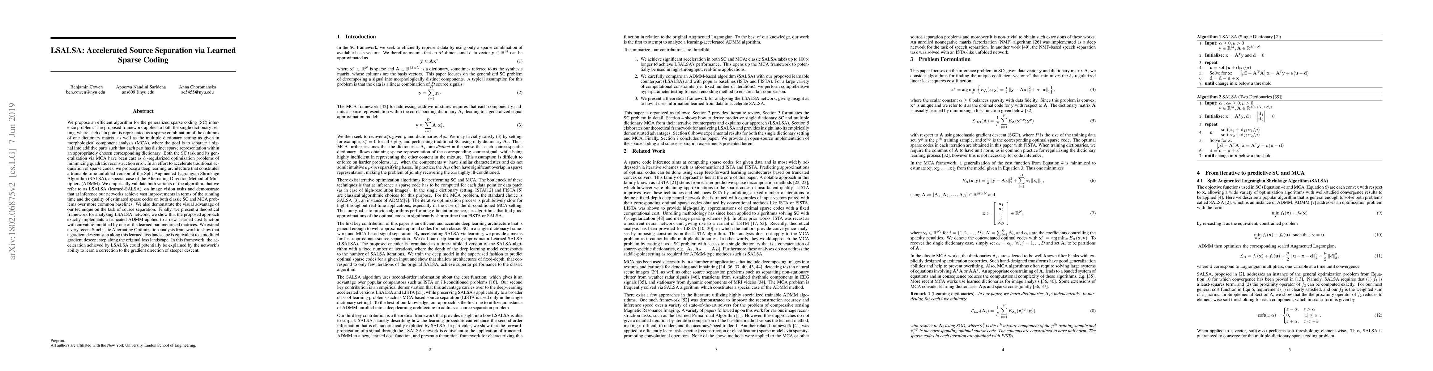 We propose an efficient algorithm for the generalized sparse coding (SC) inference problem. The proposed framework applies to both the single dictionary setting, where each data point is represented as a sparse combination of the columns of one dictionary matrix, as well as the multiple dictionary setting as given in morphological component analysis (MCA), where the goal is to separate a signal into additive parts such that each part has distinct sparse representation within a corresponding dictionary. Both the SC task and its generalization via MCA have been cast as $\ell_1$-regularized least-squares optimization problems. To accelerate traditional acquisition of sparse codes, we propose a deep learning architecture that constitutes a trainable time-unfolded version of the Split Augmented Lagrangian Shrinkage Algorithm (SALSA), a special case of the Alternating Direction Method of Multipliers (ADMM). We empirically validate both variants of the algorithm, that we refer to as LSALSA (learned-SALSA), on image vision tasks and demonstrate that at inference our networks achieve vast improvements in terms of the running time, the quality of estimated sparse codes, and visual clarity on both classic SC and MCA problems. Finally, we present a theoretical framework for analyzing LSALSA network: we show that the proposed approach exactly implements a truncated ADMM applied to a new, learned cost function with curvature modified by one of the learned parameterized matrices. We extend a very recent Stochastic Alternating Optimization analysis framework to show that a gradient descent step along this learned loss landscape is equivalent to a modified gradient descent step along the original loss landscape. In this framework, the acceleration achieved by LSALSA could potentially be explained by the network's ability to learn a correction to the gradient direction of steeper descent.
