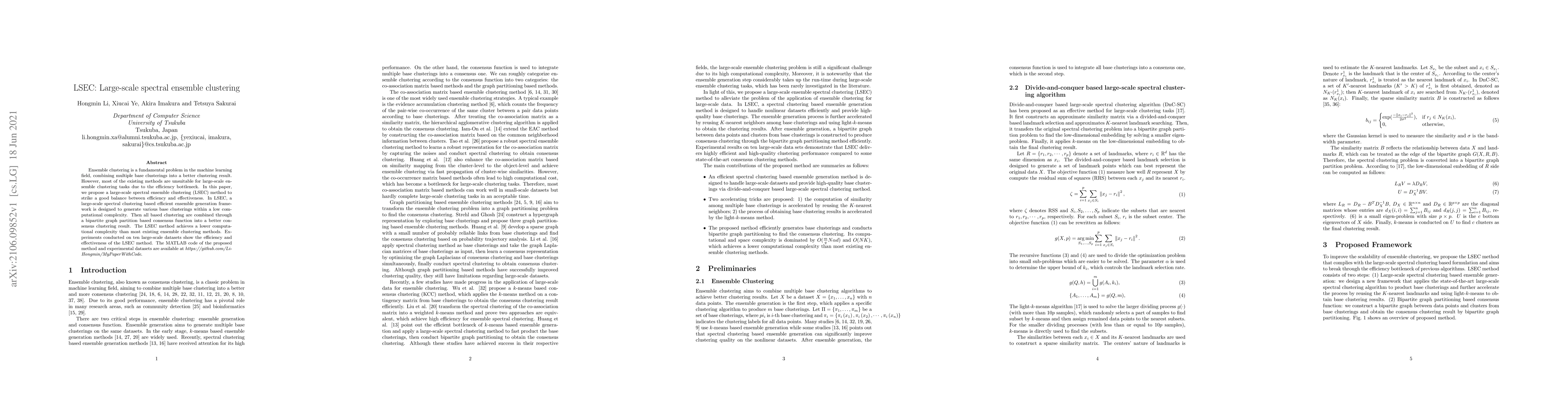 The paper proposes LSEC, a large-scale spectral ensemble clustering method that efficiently combines multiple base clusterings to achieve better results, addressing the efficiency bottleneck of existing methods. Experiments on ten large-scale datasets demonstrate its superior efficiency and effectiveness.