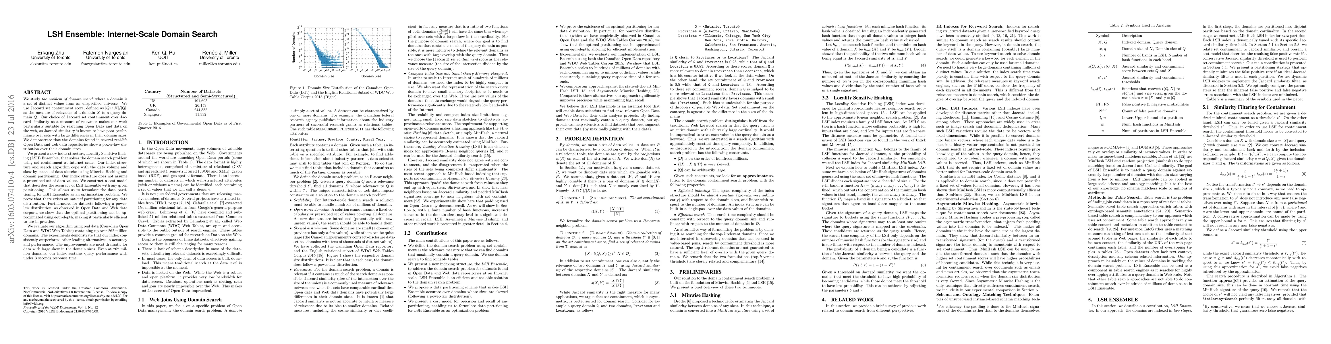 We study the problem of domain search where a domain is a set of distinct values from an unspecified universe. We use Jaccard set containment, defined as $|Q \cap X|/|Q|$, as the relevance measure of a domain $X$ to a query domain $Q$. Our choice of Jaccard set containment over Jaccard similarity makes our work particularly suitable for searching Open Data and data on the web, as Jaccard similarity is known to have poor performance over sets with large differences in their domain sizes. We demonstrate that the domains found in several real-life Open Data and web data repositories show a power-law distribution over their domain sizes. We present a new index structure, Locality Sensitive Hashing (LSH) Ensemble, that solves the domain search problem using set containment at Internet scale. Our index structure and search algorithm cope with the data volume and skew by means of data sketches (MinHash) and domain partitioning. Our index structure does not assume a prescribed set of values. We construct a cost model that describes the accuracy of LSH Ensemble with any given partitioning. This allows us to formulate the partitioning for LSH Ensemble as an optimization problem. We prove that there exists an optimal partitioning for any distribution. Furthermore, for datasets following a power-law distribution, as observed in Open Data and Web data corpora, we show that the optimal partitioning can be approximated using equi-depth, making it efficient to use in practice. We evaluate our algorithm using real data (Canadian Open Data and WDC Web Tables) containing up over 262 M domains. The experiments demonstrate that our index consistently outperforms other leading alternatives in accuracy and performance. The improvements are most dramatic for data with large skew in the domain sizes. Even at 262 M domains, our index sustains query performance with under 3 seconds response time.