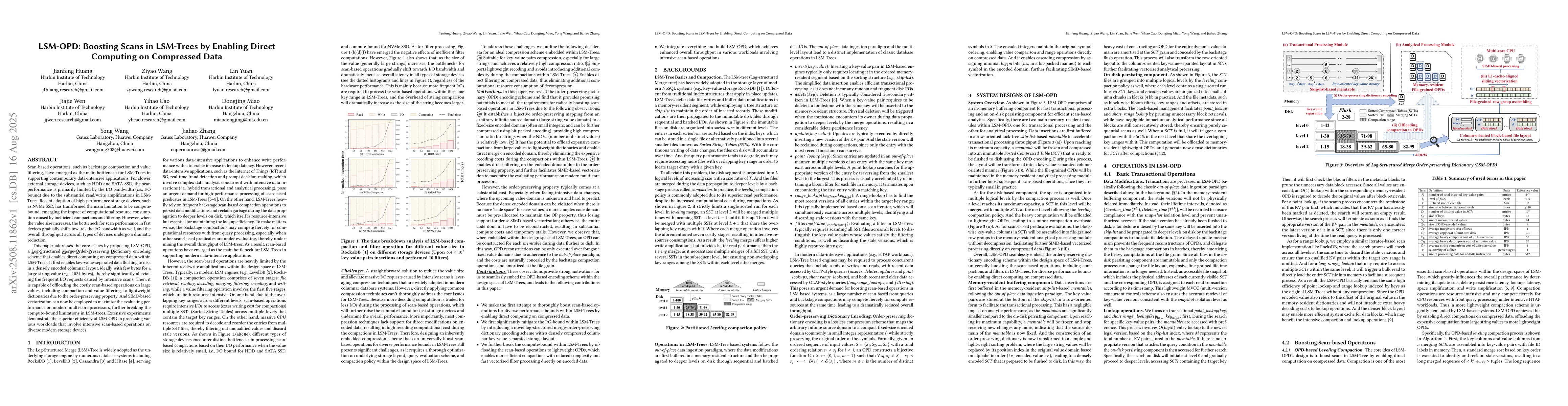 Scan-based operations, such as backstage compaction and value filtering, have emerged as the main bottleneck for LSM-Trees in supporting contemporary data-intensive applications. For slower external storage devices, such as HDD and SATA SSD, the scan performance is primarily limited by the I/O bandwidth (i.e., I/O bound) due to the substantial read/write amplifications in LSM-Trees. Recent adoption of high-performance storage devices, such as NVMe SSD, has transformed the main limitation to be compute-bound, emerging the impact of computational resource consumption caused by inefficient compactions and filtering. However, when the value size increases, the bottleneck for scan performance in fast devices gradually shifts towards the I/O bandwidth as well, and the overall throughput across all types of devices undergo a dramatic reduction. This paper addresses the core issues by proposing LSM-OPD, a Log-S tructured M erge-O rder- Preserving Dictionary encoding scheme that enables direct computing on compressed data within LSM-Trees. It first enables key-value-separated data flushing to disk in a densely encoded columnar layout, ideally with few bytes for a large string value (e.g., 1024 bytes), thereby significantly alleviating the frequent I/O requests caused by intensive scans. Then, it is capable of offloading the costly scan-based operations on large values, including compaction and value filtering, to lightweight dictionaries due to the order-preserving property. And SIMD-based vectorization can now be employed to maximize the evaluating performance on modern multi-core processors, further breaking the compute-bound limitations in LSM-trees. Extensive experiments demonstrate the superior efficiency of LSM-OPD in processing various workloads that involve intensive scan-based operations on diverse modern storage devices.