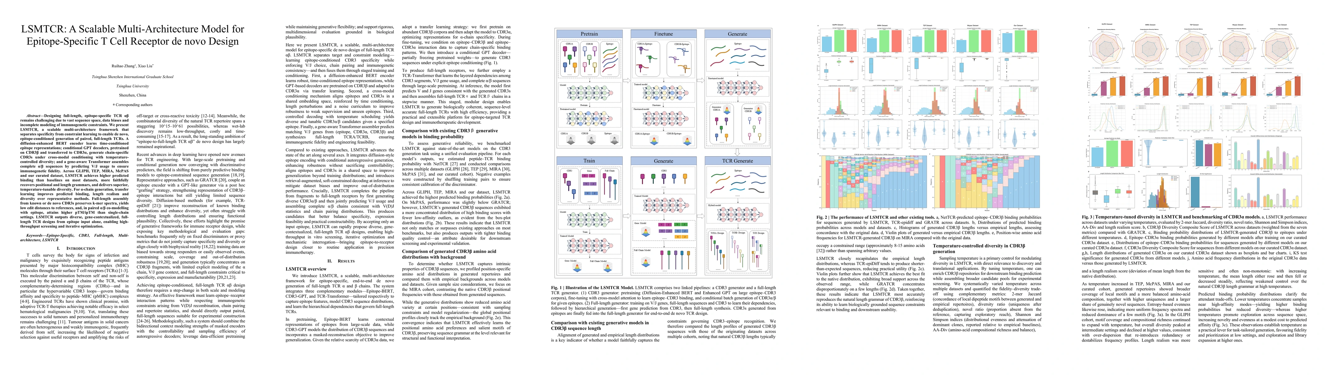Designing full-length, epitope-specific TCR {\alpha}\b{eta} remains challenging due to vast sequence space, data biases and incomplete modeling of immunogenetic constraints. We present LSMTCR, a scalable multi-architecture framework that separates specificity from constraint learning to enable de novo, epitope-conditioned generation of paired, full-length TCRs. A diffusion-enhanced BERT encoder learns time-conditioned epitope representations; conditional GPT decoders, pretrained on CDR3\b{eta} and transferred to CDR3{\alpha}, generate chain-specific CDR3s under cross-modal conditioning with temperature-controlled diversity; and a gene-aware Transformer assembles complete {\alpha}/\b{eta} sequences by predicting V/J usage to ensure immunogenetic fidelity. Across GLIPH, TEP, MIRA, McPAS and our curated dataset, LSMTCR achieves higher predicted binding than baselines on most datasets, more faithfully recovers positional and length grammars, and delivers superior, temperature-tunable diversity. For {\alpha}-chain generation, transfer learning improves predicted binding, length realism and diversity over representative methods. Full-length assembly from known or de novo CDR3s preserves k-mer spectra, yields low edit distances to references, and, in paired {\alpha}/\b{eta} co-modelling with epitope, attains higher pTM/ipTM than single-chain settings. LSMTCR outputs diverse, gene-contextualized, full-length TCR designs from epitope input alone, enabling high-throughput screening and iterative optimization.