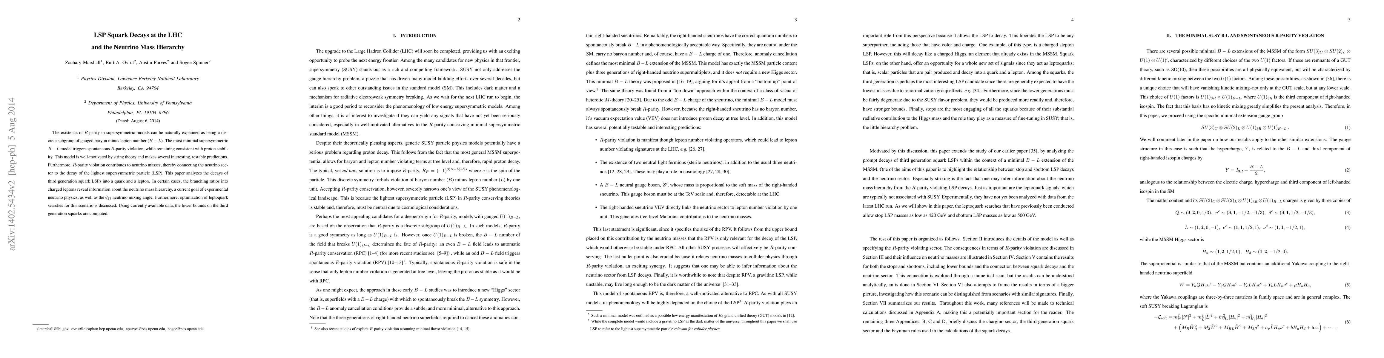 The existence of R-parity in supersymmetric models can be naturally explained as being a discrete subgroup of gauged baryon minus lepton number (B-L). The most minimal supersymmetric B-L model triggers spontaneous R-parity violation, while remaining consistent with proton stability. This model is well-motivated by string theory and makes several interesting, testable predictions. Furthermore, R-parity violation contributes to neutrino masses, thereby connecting the neutrino sector to the decay of the lightest supersymmetric particle (LSP). This paper analyzes the decays of third generation squark LSPs into a quark and a lepton. In certain cases, the branching ratios into charged leptons reveal information about the neutrino mass hierarchy, a current goal of experimental neutrino physics, as well as the $\theta_{23}$ neutrino mixing angle. Furthermore, optimization of leptoquark searches for this scenario is discussed. Using currently available data, the lower bounds on the third generation squarks are computed.