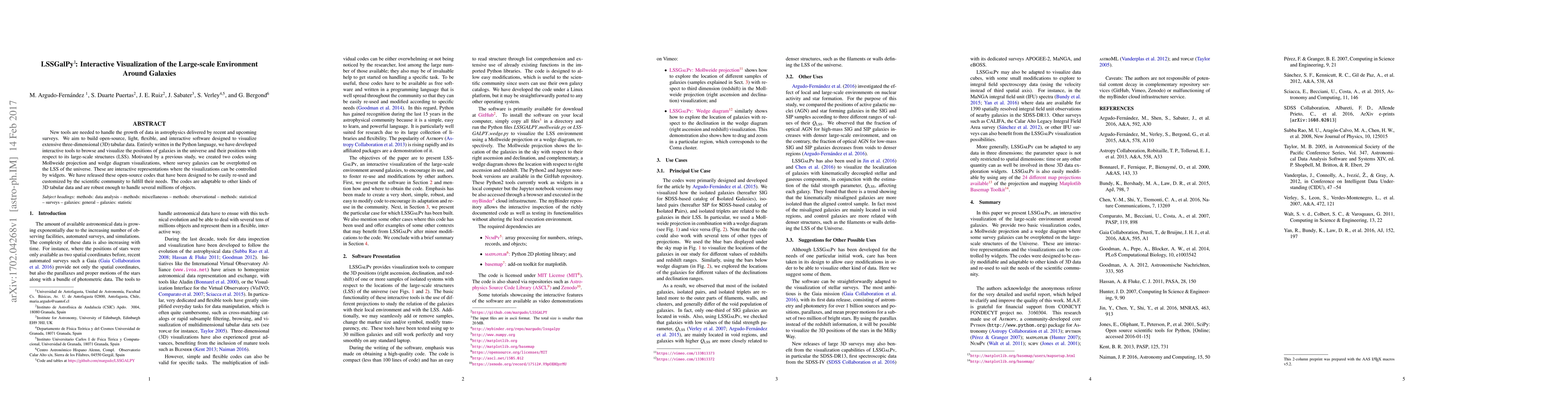 New tools are needed to handle the growth of data in astrophysics delivered by recent and upcoming surveys. We aim to build open-source, light, flexible, and interactive software designed to visualize extensive three-dimensional (3D) tabular data. Entirely written in the Python language, we have developed interactive tools to browse and visualize the positions of galaxies in the universe and their positions with respect to its large-scale structures (LSS). Motivated by a previous study, we created two codes using Mollweide projection and wedge diagram visualizations, where survey galaxies can be overplotted on the LSS of the universe. These are interactive representations where the visualizations can be controlled by widgets. We have released these open-source codes that have been designed to be easily re-used and customized by the scientific community to fulfill their needs. The codes are adaptable to other kinds of 3D tabular data and are robust enough to handle several millions of objects.