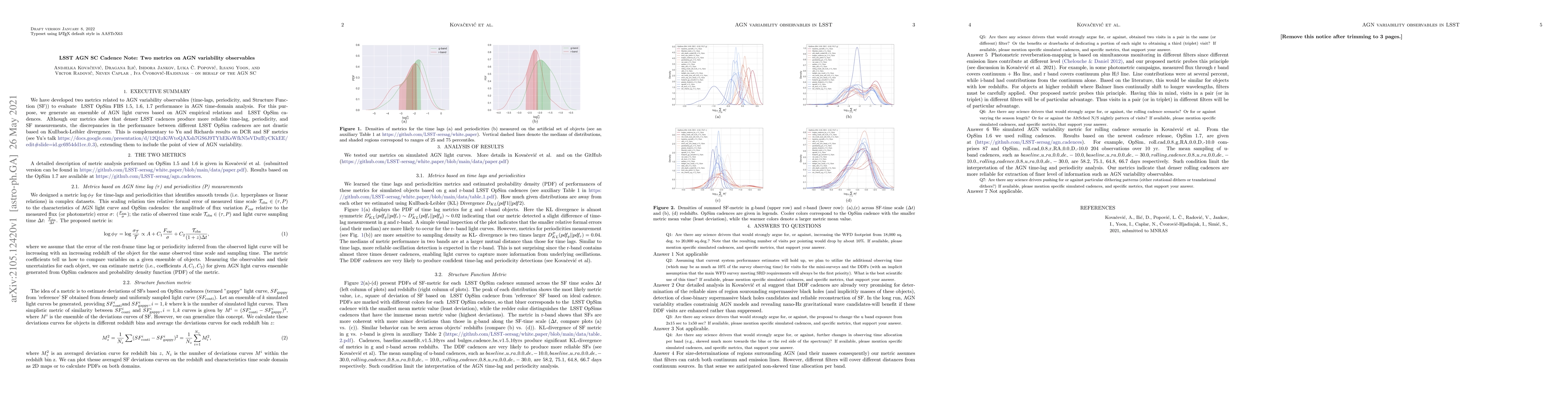 We have developed two metrics related to AGN variability observables (time-lags, periodicity, and Structure Function (SF)) to evaluate LSST OpSim FBS 1.5, 1.6, 1.7 performance in AGN time-domain analysis. For this purpose, we generate an ensemble of AGN light curves based on AGN empirical relations and LSST OpSim cadences. Although our metrics show that denser LSST cadences produce more reliable time-lag, periodicity, and SF measurements, the discrepancies in the performance between different LSST OpSim cadences are not drastic based on Kullback-Leibler divergence. This is complementary to Yu and Richards results on DCR and SF metrics, extending them to include the point of view of AGN variability.