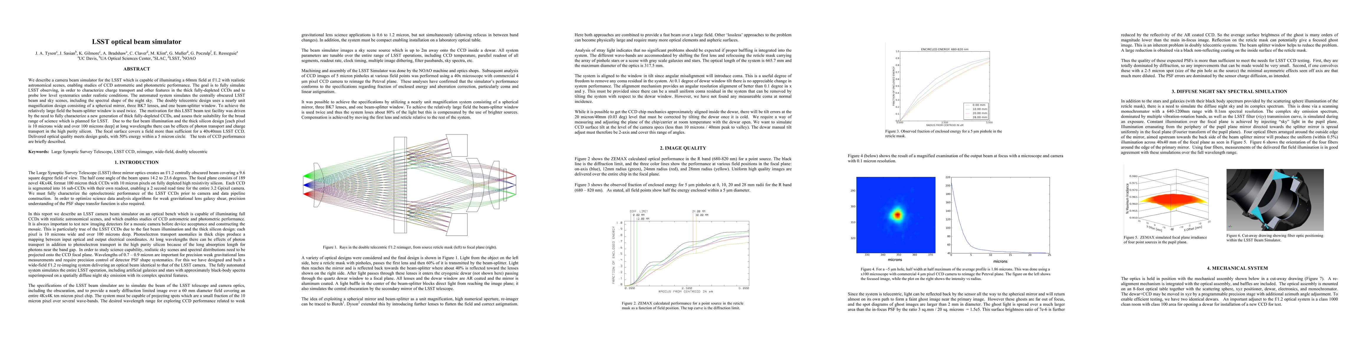 We describe a camera beam simulator for the LSST which is capable of illuminating a 60mm field at f/1.2 with realistic astronomical scenes, enabling studies of CCD astrometric and photometric performance. The goal is to fully simulate LSST observing, in order to characterize charge transport and other features in the thick fully depleted CCDs and to probe low level systematics under realistic conditions. The automated system simulates the centrally obscured LSST beam and sky scenes, including the spectral shape of the night sky. The doubly telecentric design uses a nearly unit magnification design consisting of a spherical mirror, three BK7 lenses, and one beam-splitter window. To achieve the relatively large field the beam-splitter window is used twice. The motivation for this LSST beam test facility was driven by the need to fully characterize a new generation of thick fully-depleted CCDs, and assess their suitability for the broad range of science which is planned for LSST. Due to the fast beam illumination and the thick silicon design [each pixel is 10 microns wide and over 100 microns deep] at long wavelengths there can be effects of photon transport and charge transport in the high purity silicon. The focal surface covers a field more than sufficient for a 40x40 mm LSST CCD. Delivered optical quality meets design goals, with 50% energy within a 5 micron circle. The tests of CCD performance are briefly described.