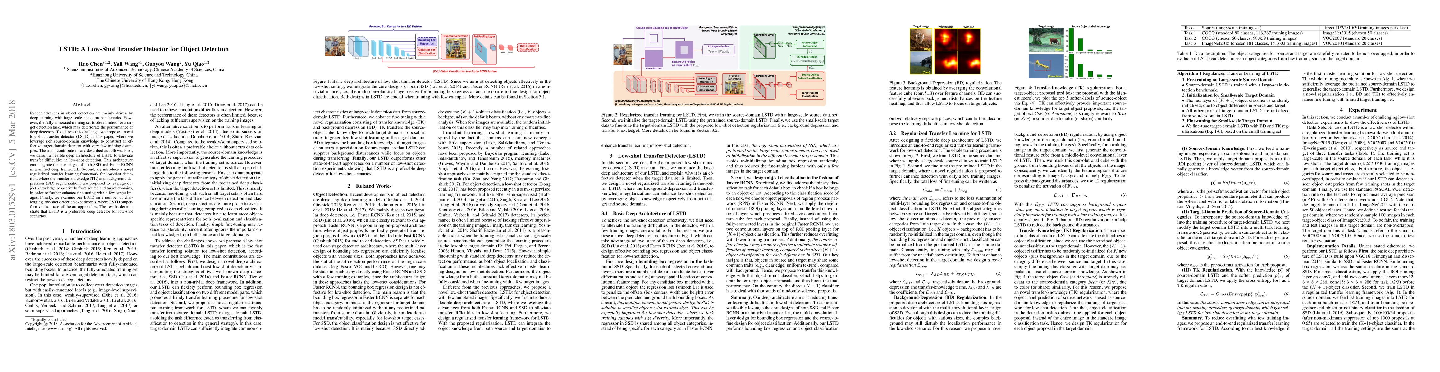 Recent advances in object detection are mainly driven by deep learning with large-scale detection benchmarks. However, the fully-annotated training set is often limited for a target detection task, which may deteriorate the performance of deep detectors. To address this challenge, we propose a novel low-shot transfer detector (LSTD) in this paper, where we leverage rich source-domain knowledge to construct an effective target-domain detector with very few training examples. The main contributions are described as follows. First, we design a flexible deep architecture of LSTD to alleviate transfer difficulties in low-shot detection. This architecture can integrate the advantages of both SSD and Faster RCNN in a unified deep framework. Second, we introduce a novel regularized transfer learning framework for low-shot detection, where the transfer knowledge (TK) and background depression (BD) regularizations are proposed to leverage object knowledge respectively from source and target domains, in order to further enhance fine-tuning with a few target images. Finally, we examine our LSTD on a number of challenging low-shot detection experiments, where LSTD outperforms other state-of-the-art approaches. The results demonstrate that LSTD is a preferable deep detector for low-shot scenarios.