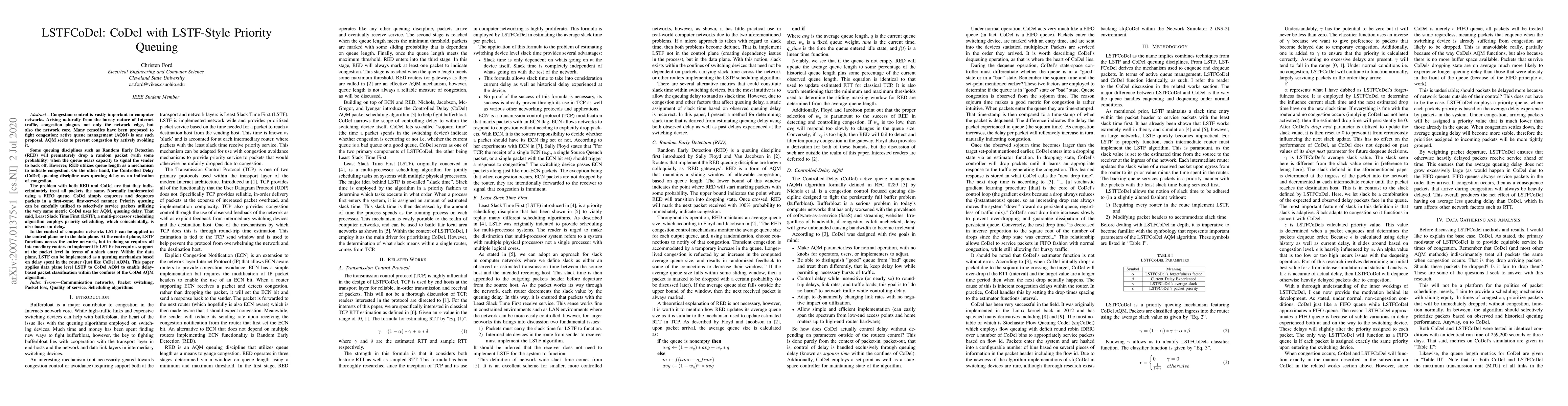 This paper proposes LSTFCoDel, a modified version of the CoDel active queue management algorithm that incorporates Least Slack Time First (LSTF)-style priority queuing to manage congestion more effectively by classifying packets based on their queuing delay. Unlike traditional CoDel, LSTFCoDel uses delay-based priority queuing to prioritize packets, aiming to improve congestion control in computer networks.