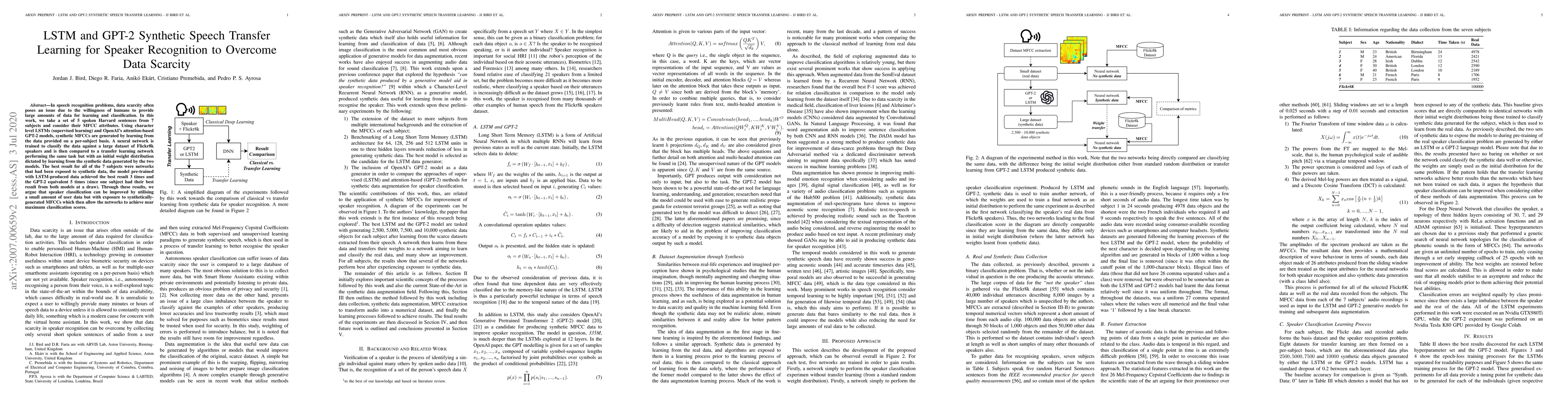 In speech recognition problems, data scarcity often poses an issue due to the willingness of humans to provide large amounts of data for learning and classification. In this work, we take a set of 5 spoken Harvard sentences from 7 subjects and consider their MFCC attributes. Using character level LSTMs (supervised learning) and OpenAI's attention-based GPT-2 models, synthetic MFCCs are generated by learning from the data provided on a per-subject basis. A neural network is trained to classify the data against a large dataset of Flickr8k speakers and is then compared to a transfer learning network performing the same task but with an initial weight distribution dictated by learning from the synthetic data generated by the two models. The best result for all of the 7 subjects were networks that had been exposed to synthetic data, the model pre-trained with LSTM-produced data achieved the best result 3 times and the GPT-2 equivalent 5 times (since one subject had their best result from both models at a draw). Through these results, we argue that speaker classification can be improved by utilising a small amount of user data but with exposure to synthetically-generated MFCCs which then allow the networks to achieve near maximum classification scores.