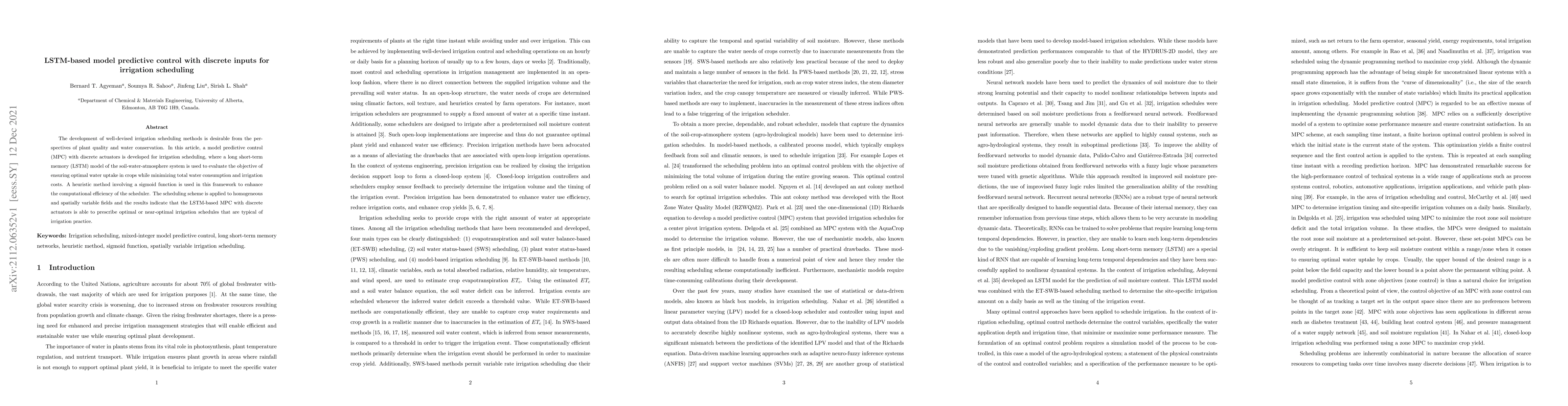 This paper develops an LSTM-based model predictive control (MPC) for irrigation scheduling with discrete inputs, aiming to optimize water uptake while minimizing consumption and costs. The proposed method, enhanced with a heuristic sigmoid function, effectively generates optimal irrigation schedules for both homogeneous and variable fields.