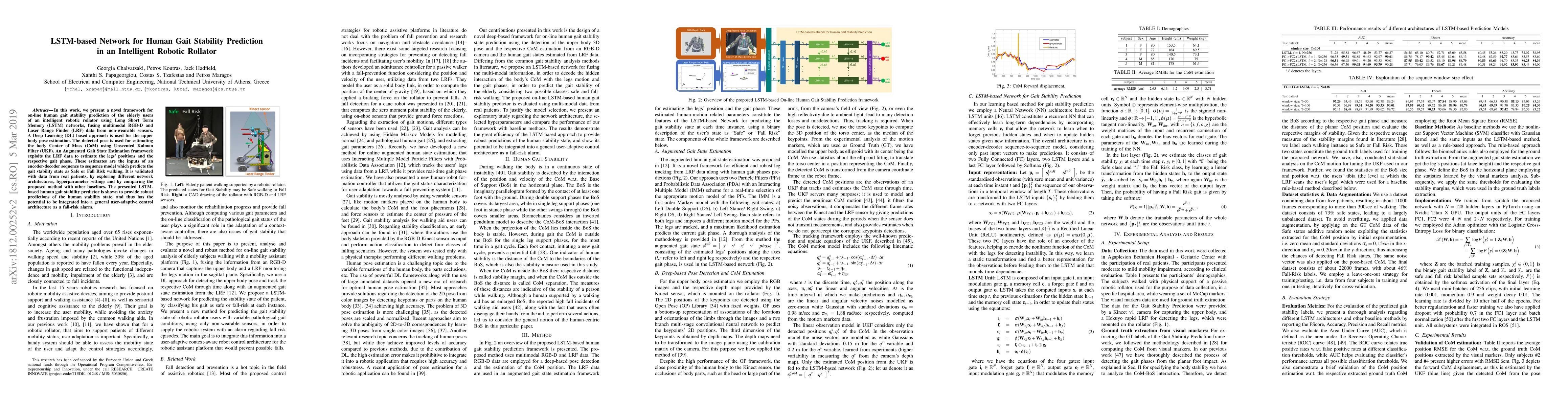This paper proposes an LSTM-based framework for predicting human gait stability in elderly users of an intelligent robotic rollator, utilizing multimodal sensor data and a deep learning approach for pose estimation and stability prediction. The method is validated with real patient data, demonstrating robust fall risk detection.