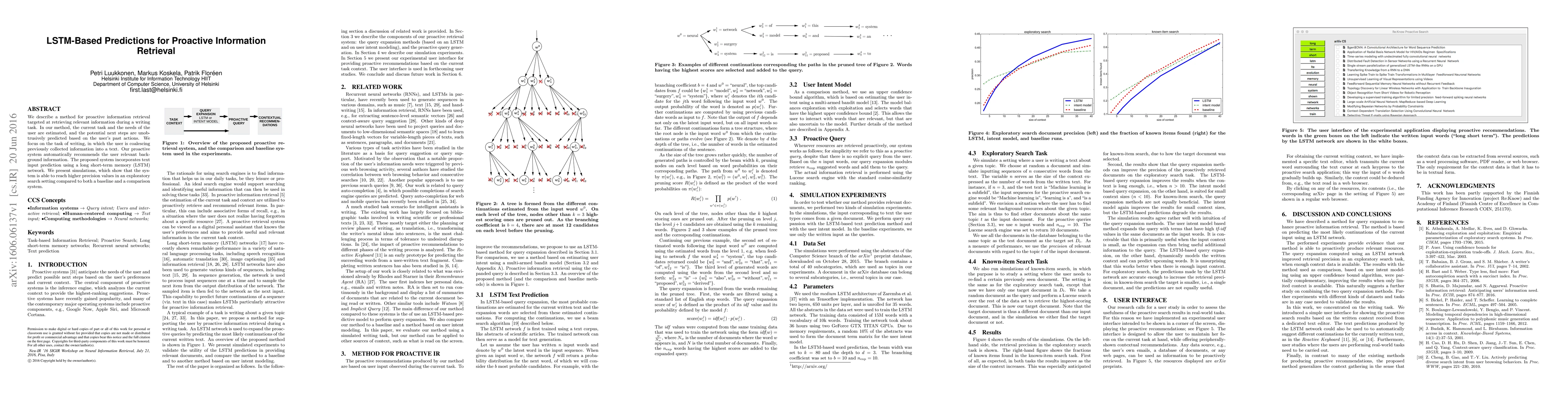 We describe a method for proactive information retrieval targeted at retrieving relevant information during a writing task. In our method, the current task and the needs of the user are estimated, and the potential next steps are unobtrusively predicted based on the user's past actions. We focus on the task of writing, in which the user is coalescing previously collected information into a text. Our proactive system automatically recommends the user relevant background information. The proposed system incorporates text input prediction using a long short-term memory (LSTM) network. We present simulations, which show that the system is able to reach higher precision values in an exploratory search setting compared to both a baseline and a comparison system.