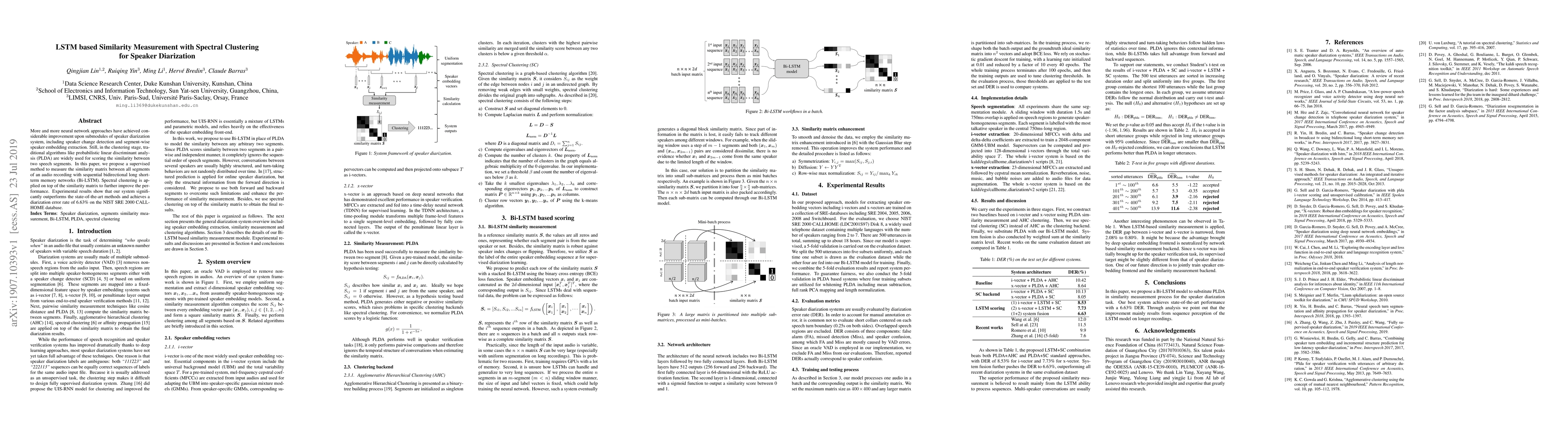 This paper proposes a supervised method using bidirectional LSTM networks to measure similarity between speech segments for speaker diarization, followed by spectral clustering for improved clustering performance. The proposed approach outperforms existing methods, achieving a diarization error rate of 6.63% on the NIST SRE 2000 CALLHOME database.