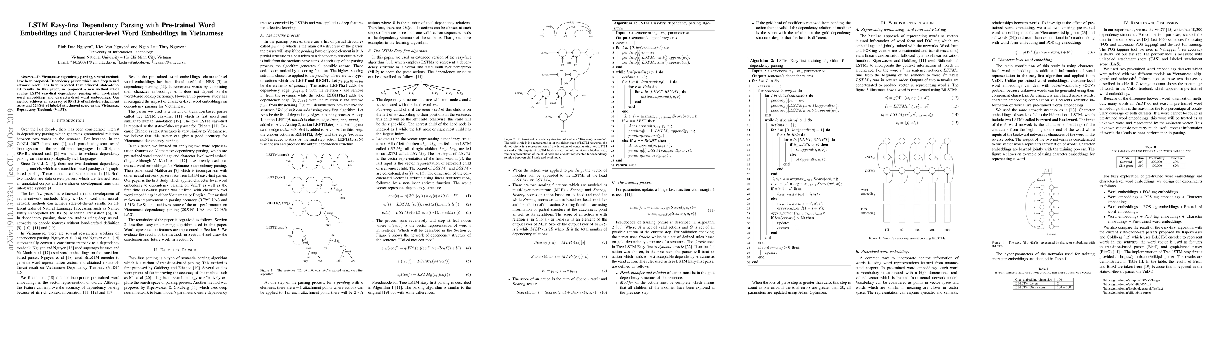 This paper proposes an LSTM-based easy-first dependency parsing method for Vietnamese using pre-trained word embeddings and character-level word embeddings, achieving 80.91% accuracy in unlabeled attachment score and 72.98% in labeled attachment score on the Vietnamese Dependency Treebank (VnDT).