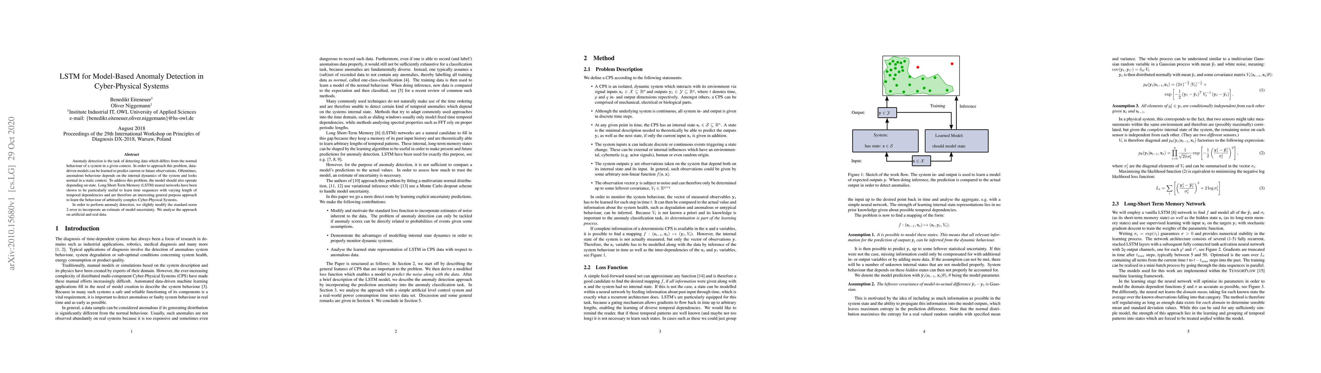 Anomaly detection is the task of detecting data which differs from the normal behaviour of a system in a given context. In order to approach this problem, data-driven models can be learned to predict current or future observations. Oftentimes, anomalous behaviour depends on the internal dynamics of the system and looks normal in a static context. To address this problem, the model should also operate depending on state. Long Short-Term Memory (LSTM) neural networks have been shown to be particularly useful to learn time sequences with varying length of temporal dependencies and are therefore an interesting general purpose approach to learn the behaviour of arbitrarily complex Cyber-Physical Systems. In order to perform anomaly detection, we slightly modify the standard norm 2 error to incorporate an estimate of model uncertainty. We analyse the approach on artificial and real data.