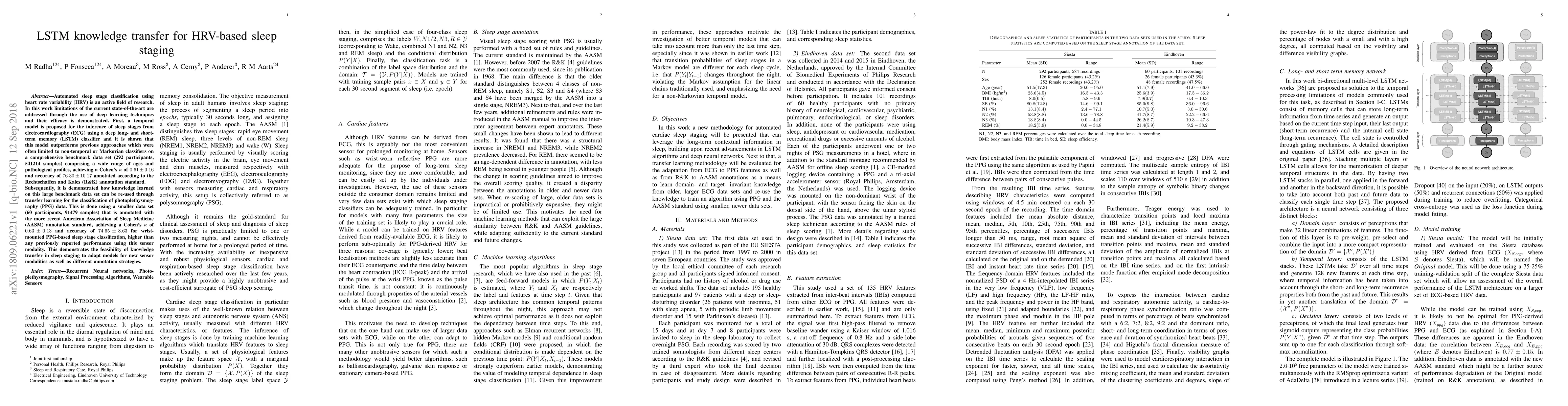 Automated sleep stage classification using heart-rate variability is an active field of research. In this work limitations of the current state-of-the-art are addressed through the use of deep learning techniques and their efficacy is demonstrated. First, a temporal model is proposed for the inference of sleep stages from electrocardiography using a deep long- and short-term (LSTM) classifier and it is shown that this model outperforms previous approaches which were often limited to non-temporal or Markovian classifiers on a comprehensive benchmark data set (292 participants, 541214 samples) comprising a wide range of ages and pathological profiles, achieving a Cohen's $\kappa$ of $0.61\pm0.16$ and accuracy of $76.30\pm10.17$ annotated according to the Rechtschaffen & Kales annotation standard. Subsequently, it is demonstrated how knowledge learned on this large benchmark data set can be re-used through transfer learning for the classification of photoplethysmography (PPG) data. This is done using a smaller data set (60 participants, 91479 samples) that is annotated with the more recent American Association of Sleep Medicine annotation standard, achieving a Cohen's $\kappa$ of $0.63\pm0.13$ and accuracy of $74.65\pm8.63$ for wrist-mounted PPG-based sleep stage classification, higher than any previously reported performance using this sensor modality. This demonstrates the feasibility of knowledge transfer in sleep staging to adapt models for new sensor modalities as well as different annotation strategies.