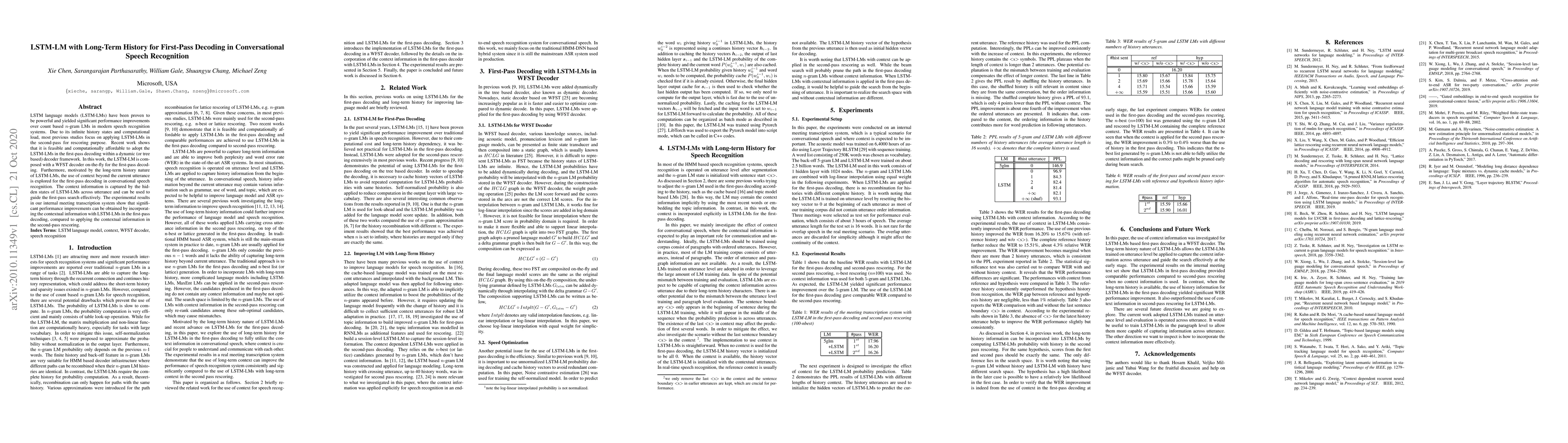 This paper explores integrating LSTM-LMs with long-term history into first-pass decoding for conversational speech recognition, achieving significant performance improvements over traditional second-pass rescoring by leveraging contextual information from hidden states across utterances. Experimental results show enhanced accuracy in an internal meeting transcription system.