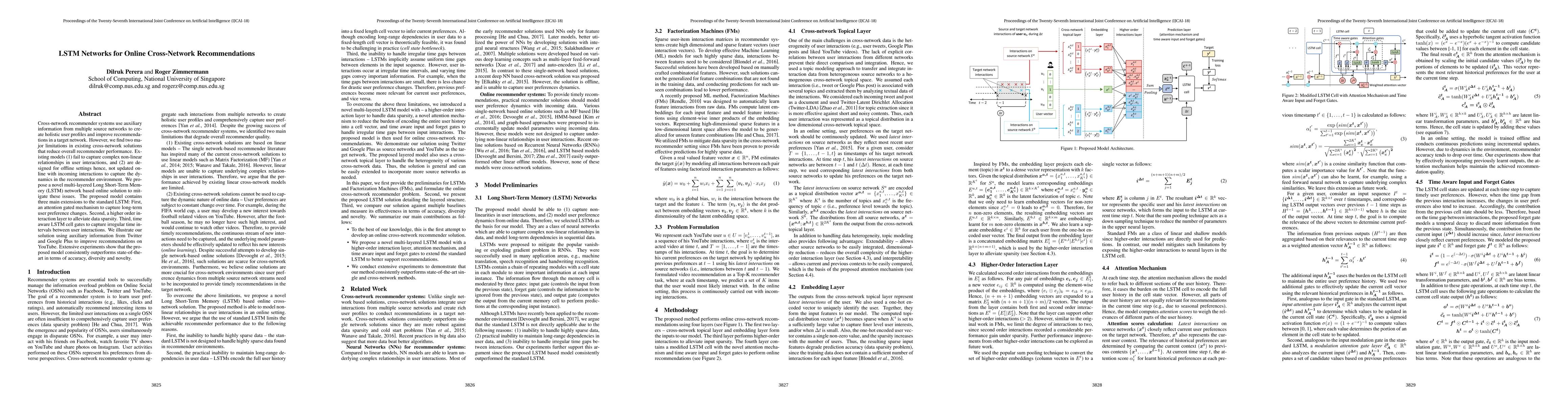 This paper introduces a novel LSTM network model for online cross-network recommendations, addressing limitations of existing models that fail to capture complex user interactions and lack online updates. The proposed model, featuring attention gating, higher-order interaction layers, and time-aware LSTM gates, significantly outperforms current methods in accuracy, diversity, and novelty, as demonstrated through experiments using Twitter, Google Plus, and YouTube data.