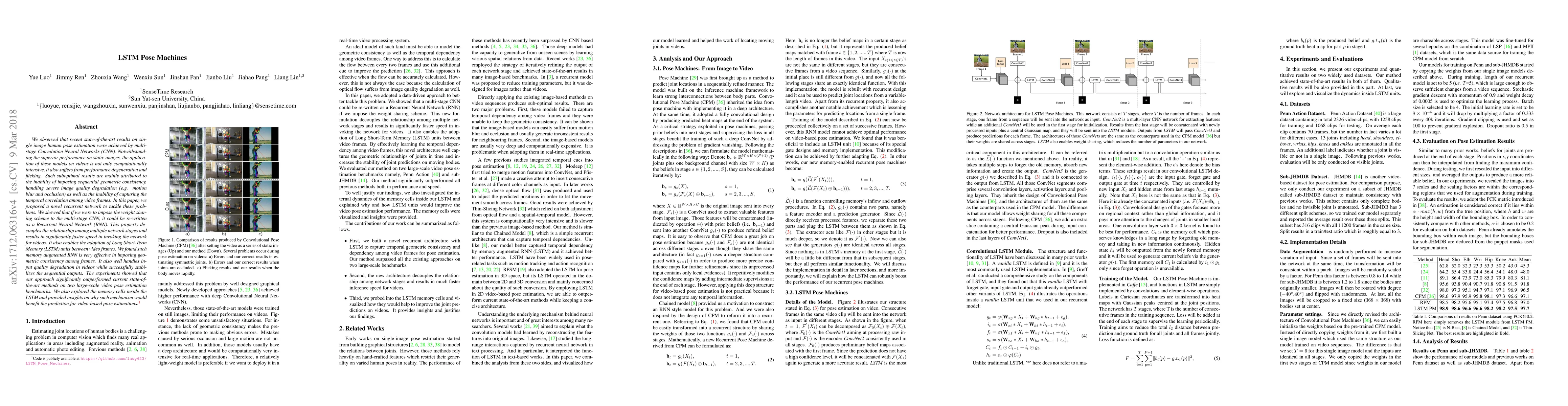 The paper introduces LSTM Pose Machines, a novel recurrent network addressing limitations of CNN-based multi-stage models in video human pose estimation. By applying weight sharing and LSTM units, it achieves faster processing, geometric consistency, and better handling of degradation issues. Results show significant improvement over existing methods on video pose estimation benchmarks.