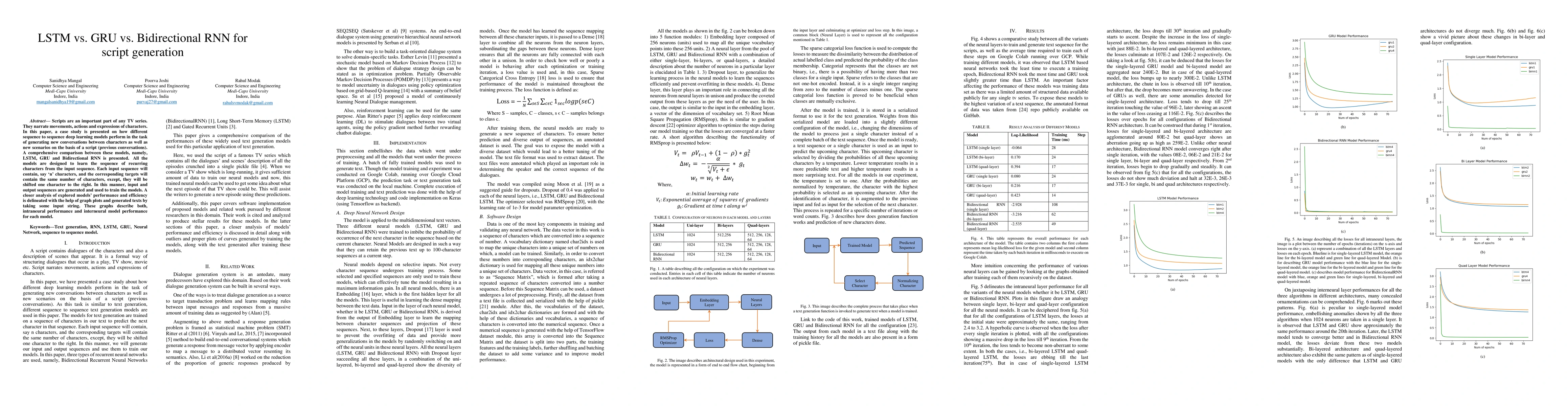 This paper compares LSTM, GRU, and Bidirectional RNN models for generating TV script conversations and scenarios. The study evaluates their performance and efficiency through graph plots and generated text samples, highlighting each model's strengths in sequence-to-sequence learning.