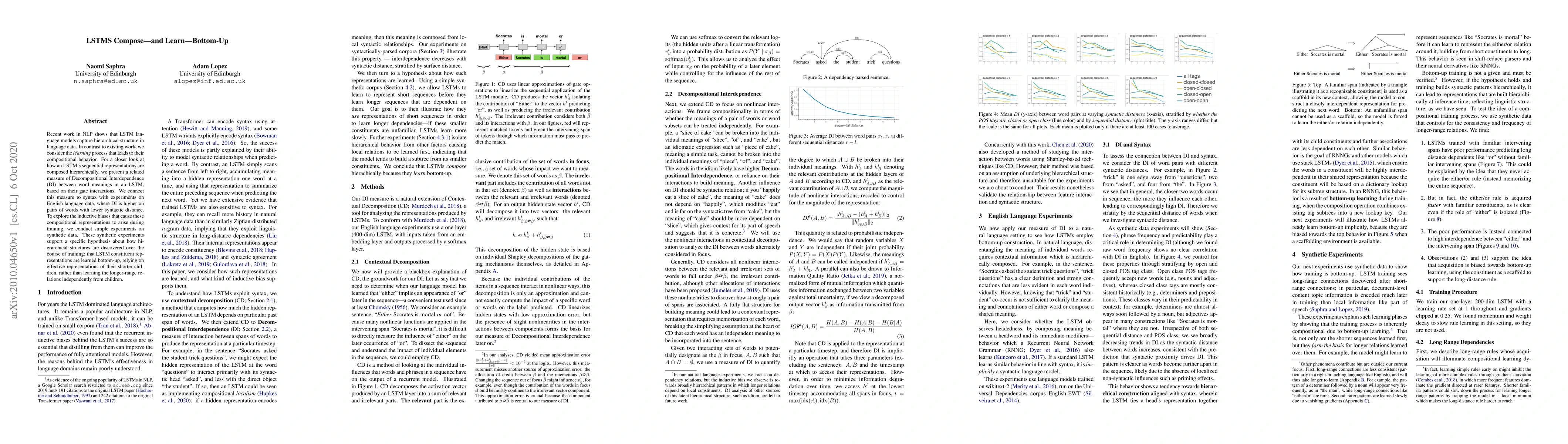 This research paper investigates how Long Short-Term Memory (LSTM) language models learn hierarchical structure in language data. It finds that LSTMs compose their representations from the bottom up, relying on effective representations of shorter words to discover longer-range relations.