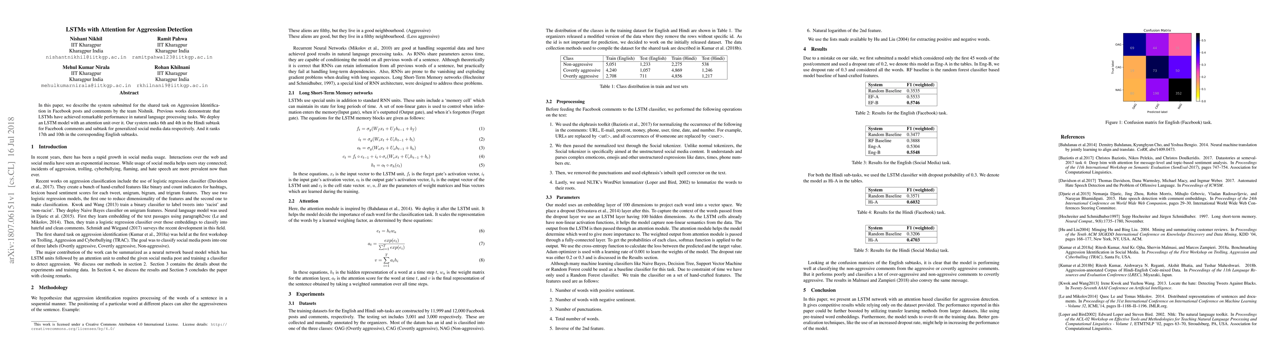 In this paper, we describe the system submitted for the shared task on Aggression Identification in Facebook posts and comments by the team Nishnik. Previous works demonstrate that LSTMs have achieved remarkable performance in natural language processing tasks. We deploy an LSTM model with an attention unit over it. Our system ranks 6th and 4th in the Hindi subtask for Facebook comments and subtask for generalized social media data respectively. And it ranks 17th and 10th in the corresponding English subtasks.