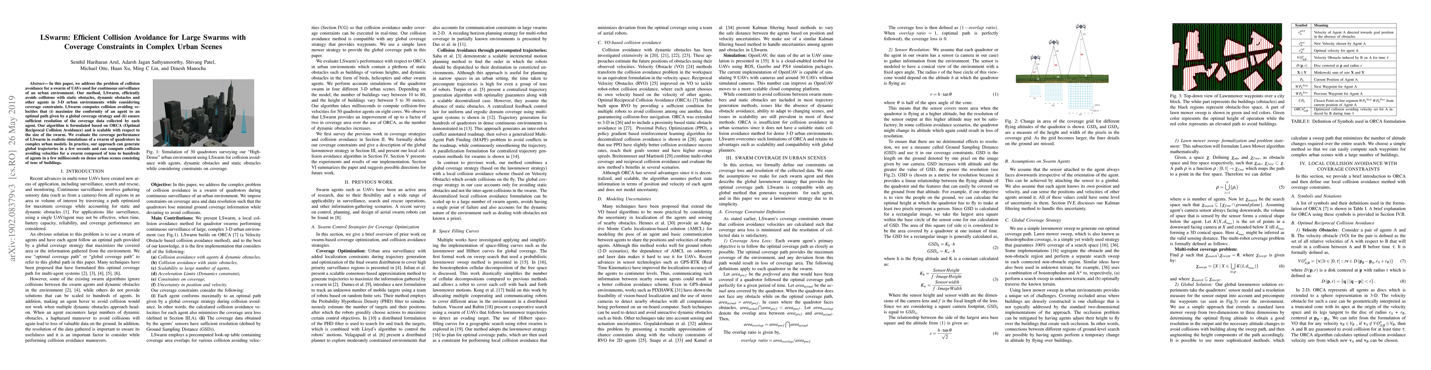 LSwarm presents an efficient algorithm for collision avoidance in large UAV swarms operating in complex urban environments, balancing coverage constraints while avoiding static and dynamic obstacles. The method scales well with swarm size and achieves near real-time performance in dense urban simulations.